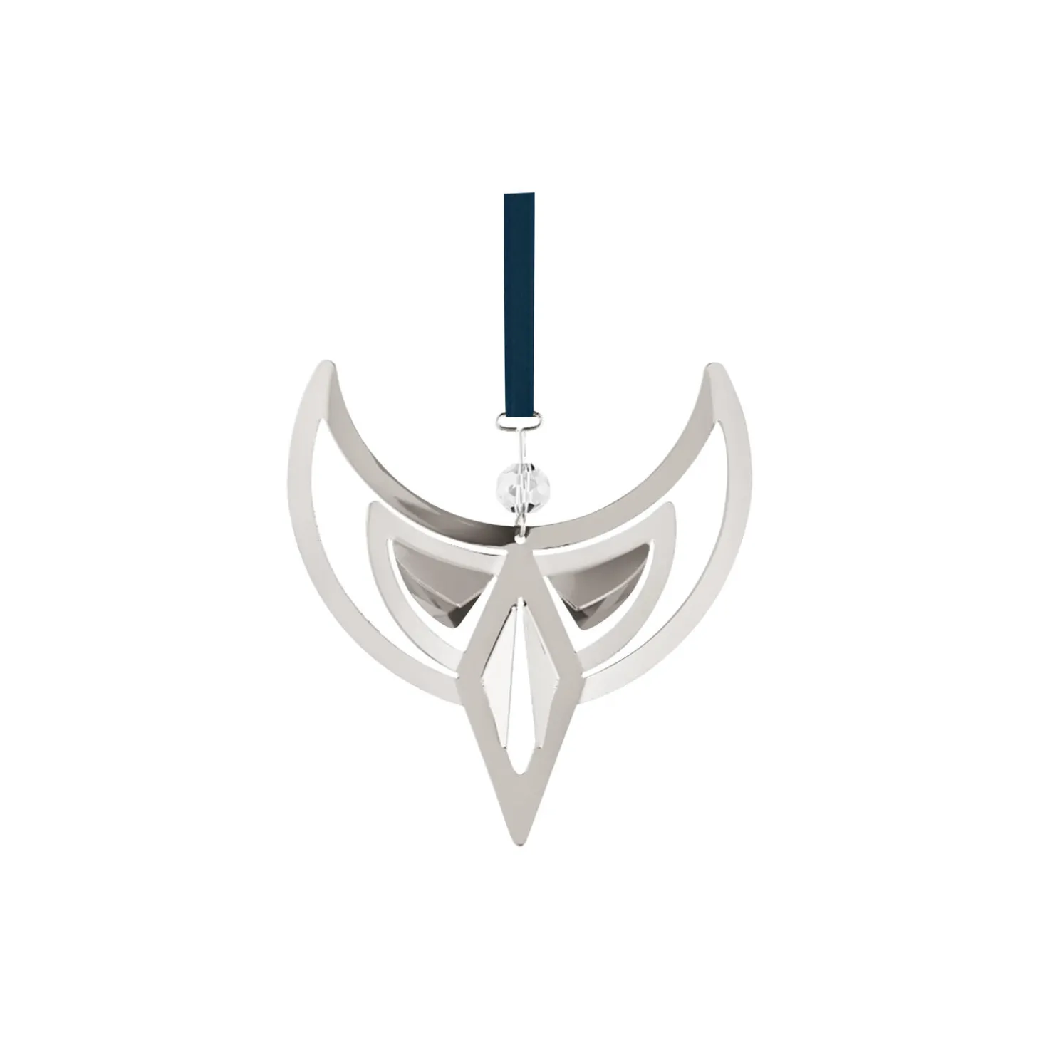 Dette smukke engleornament fra 2024 Julekollektionen er belagt med palladium og designet af Georg Jensens mangeårige samarbejdspartner Sanne Lund Traberg. Ornamentets elegante form er flankeret af englevinger og har en glimtende zirkon-kugle i toppen. Engleornamentet hænger i et flot, rødt bånd. Der medfølger også et blåt bånd, som symboliserer julekollektionens tema: en stjerneklar vinternat.