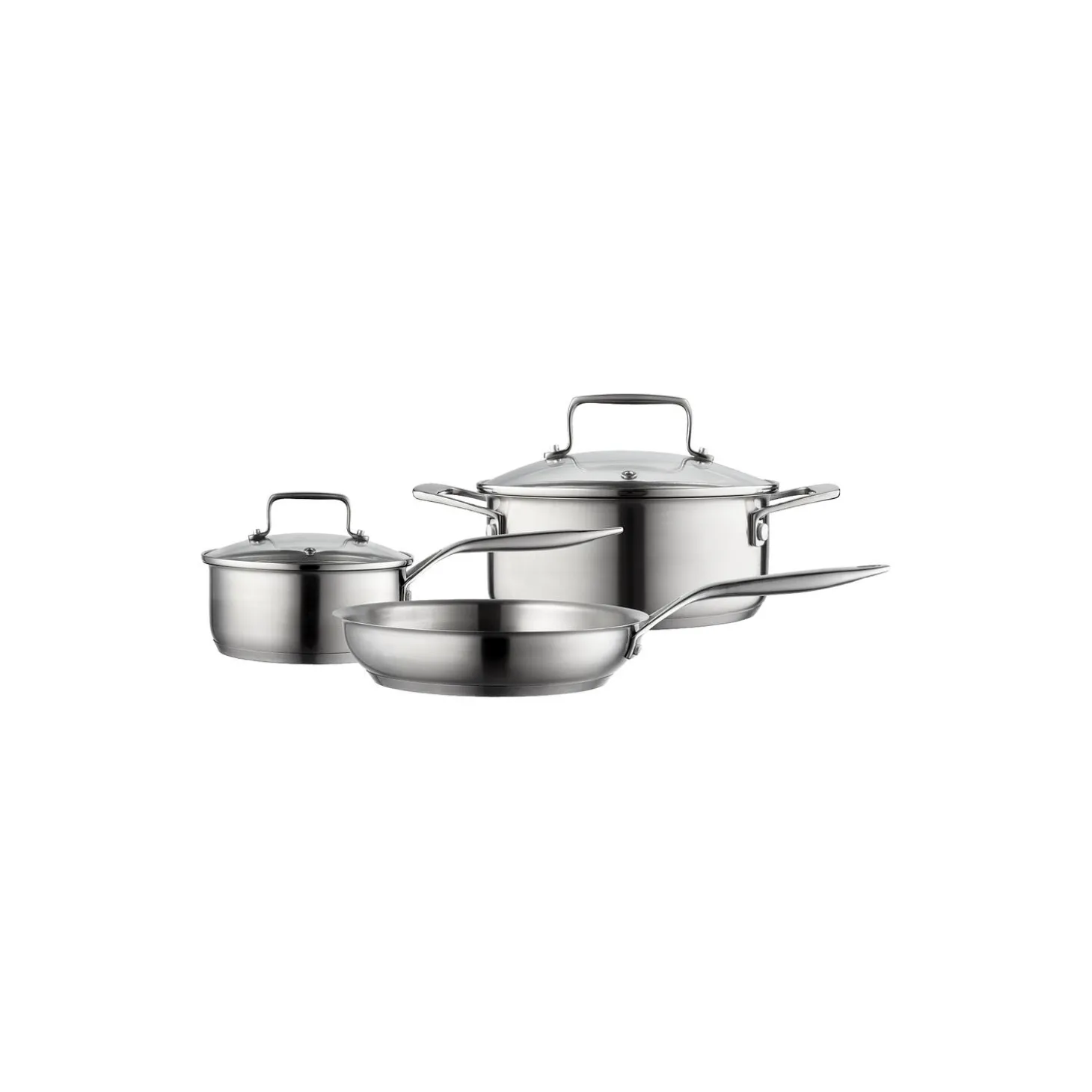 Gryde-/stegepandesæt, 5 dele. Dette perfekte startersæt består af en 1,3 l kasserolle m. låg, dia. 16 cm, en 1,7 l gryde m. låg, dia. 18 cm og en 24 cm stegepande. 79NORD-serien er fremstillet i 18/8 rustfrit stål, og glaslågene har damphul.