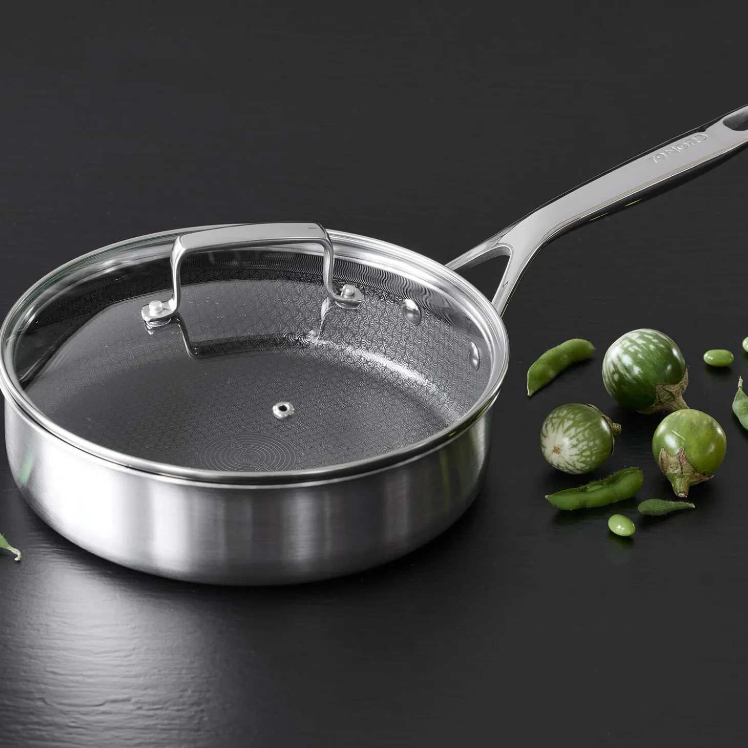 79Nord Hybrid er fremstillet af 3-ply rustfrit stål. Konstruktionen af to lag stål med et aluminiumlag imellem betyder, at varmen fordeles hurtigt og fastholdes jævnt og energieffektivt over både bund og sider, og samtidig er materialet let. Udvendigt er gryder og pander satinpolerede, indvendigt har de en innovativ hybridbelægning. Hybridbelægningen er en kombination af et forhøjet mønster i rustfrit stål og en 2-lags keramisk belægning, produceret uden PFAS. Det forhøjede mønster beskytter belægningen i bunden, og den keramiske topcoating giver non-stick-effekten. Hybridbelægningen er nem at rengøre, og alle typer redskaber kan bruges på belægningen, men vi anbefaler redskaber af træ, plast eller silikone. Inspirationen til mønsteret i hybridbelægningen kommer fra havet omkring øen Mors, fra ringe i vandet, der breder sig hurtigt og ustoppeligt.Håndtag og greb er af støbt stål. Vær opmærksom på, at de kan blive meget varme.79Nord Hybrid-produkterne kan bruges på alle varmekilder, også induktion. De kan desuden anvendes i ovn, med låg op til 200 °C, uden låg helt op til 260 °C. Produkterne er velegnede til vask i opvaskemaskine, og vi anbefaler, at de også vaskes før første brug.
