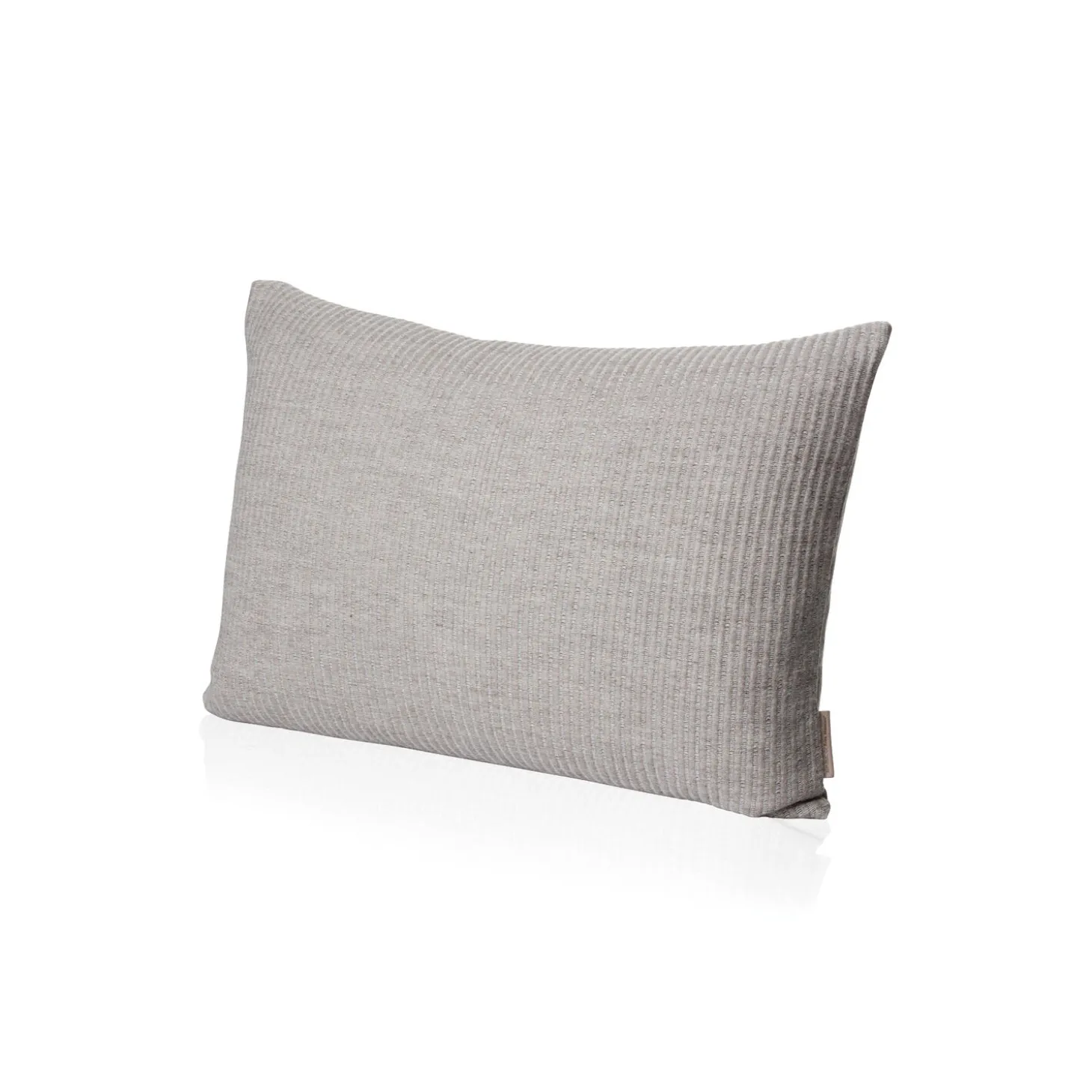 Aiayu pude med forside i vævet boliviansk uld og bagside i hør fra Fritz Hansen. Inderpude med fyld af andefjer/dun. Farve: oat. Mål: 40×60 cm. Design: Aiayu.