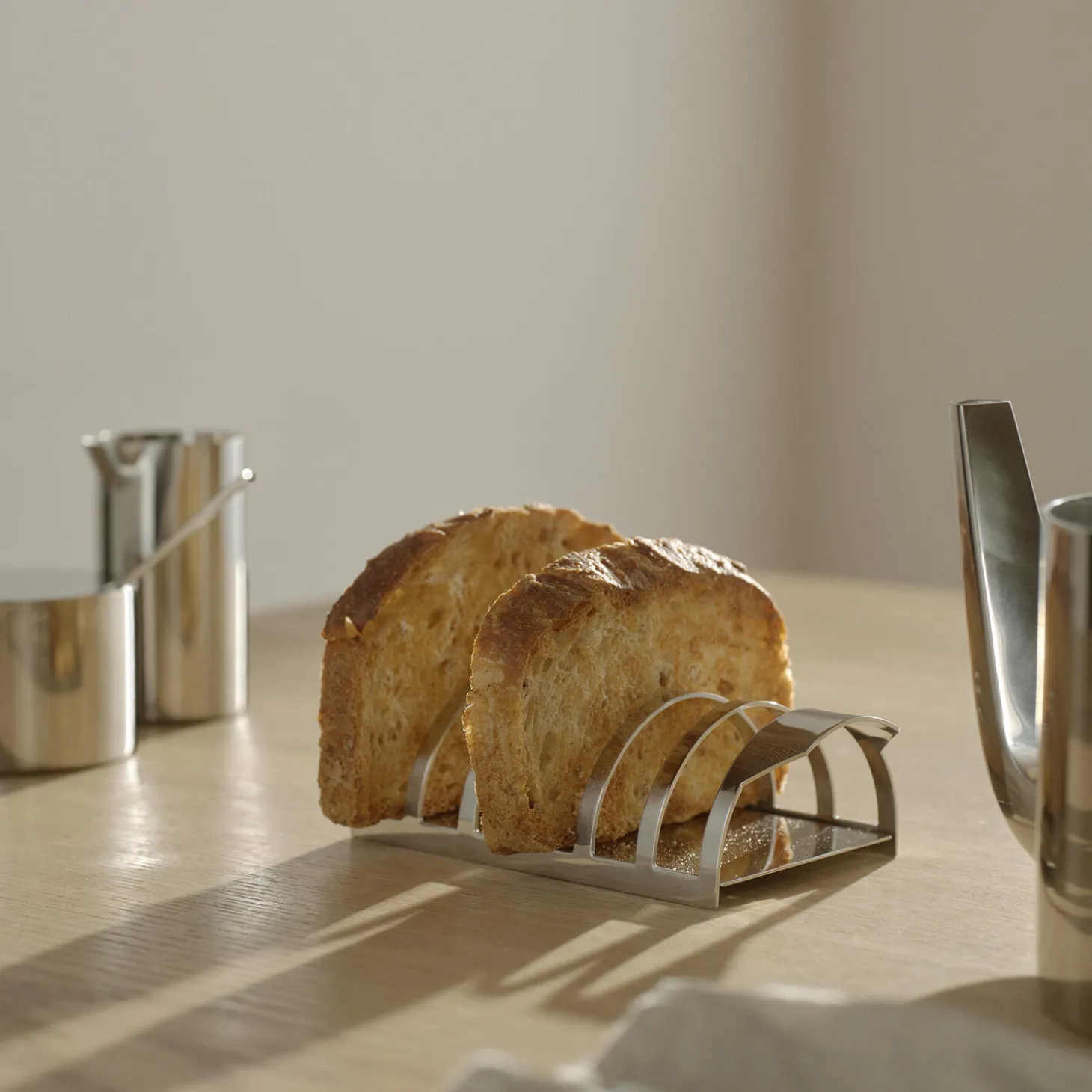 Toast holderen fra Stelton, er en del af ‘Cylinda-Line’ service, som blev skabt af Arne Jacobsen i 1967. Den tidløse toast holder i rustfrit stål har en karakteristisk cylinderform med håndtag som forlængelser til støtterne i hver ende. Et mesterværk af enkel elegance og funktionalitet, som bærer Arne Jacobsens signaturstil og Steltons kvalitetsstandard. Denne toast holder er en ægte designklassiker, der kombinerer tidløs æstetik med praktisk brug og holder sin relevans i generationer.