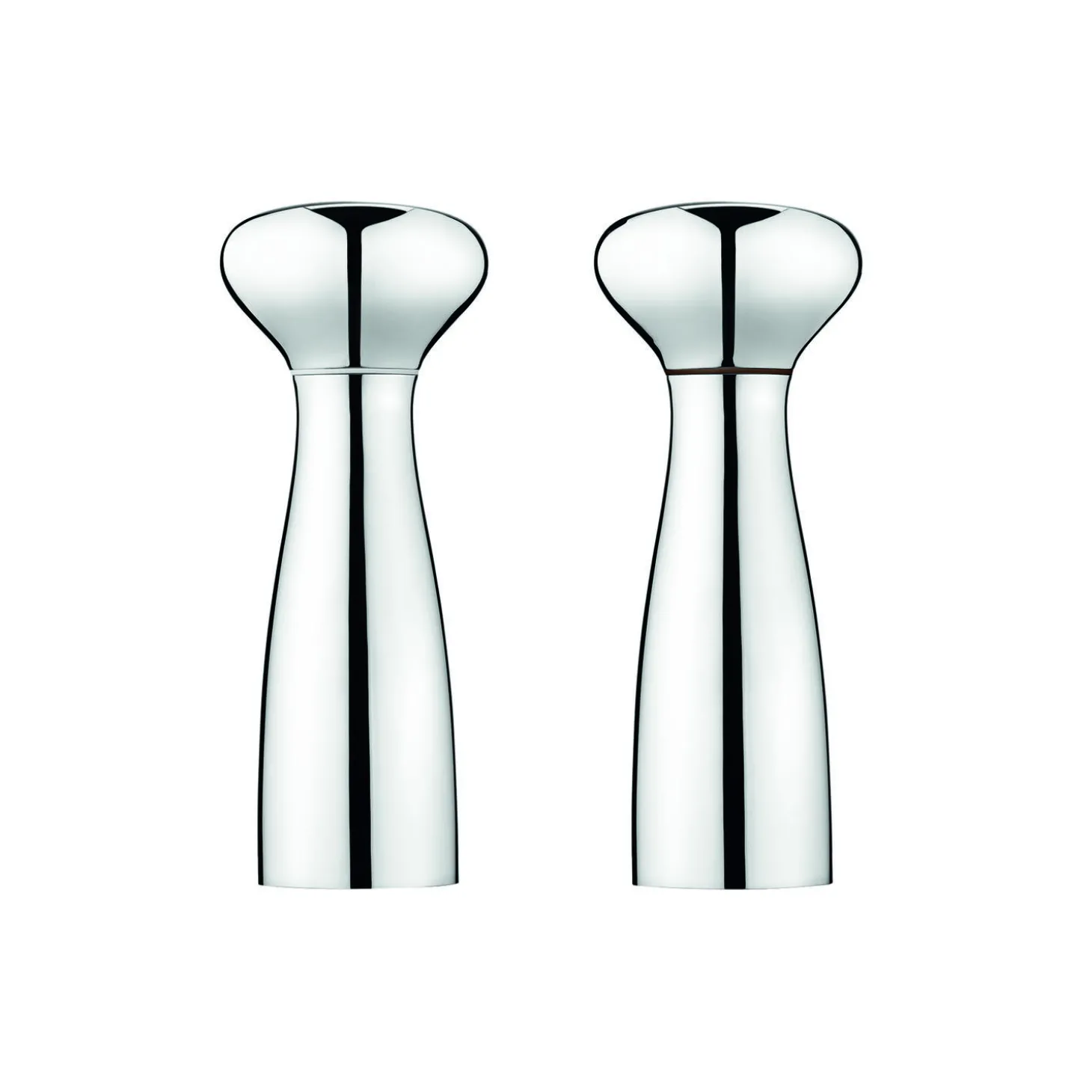Dette smukke salt og peber-sæt er et regulært stilstudie i underspillet minimalisme. Al pynt er fjernet, så det der står tilbage er en ren organisk form i højglanspoleret rustfrit stål. Form og funktion går op i en højere enhed, og kværnenes ergonomiske udformning gør, at de passer perfekt i hånden. Den justerbare all-grind teknologi sikrer derudover den rigtige størrelse af både salt- og peberkorn.