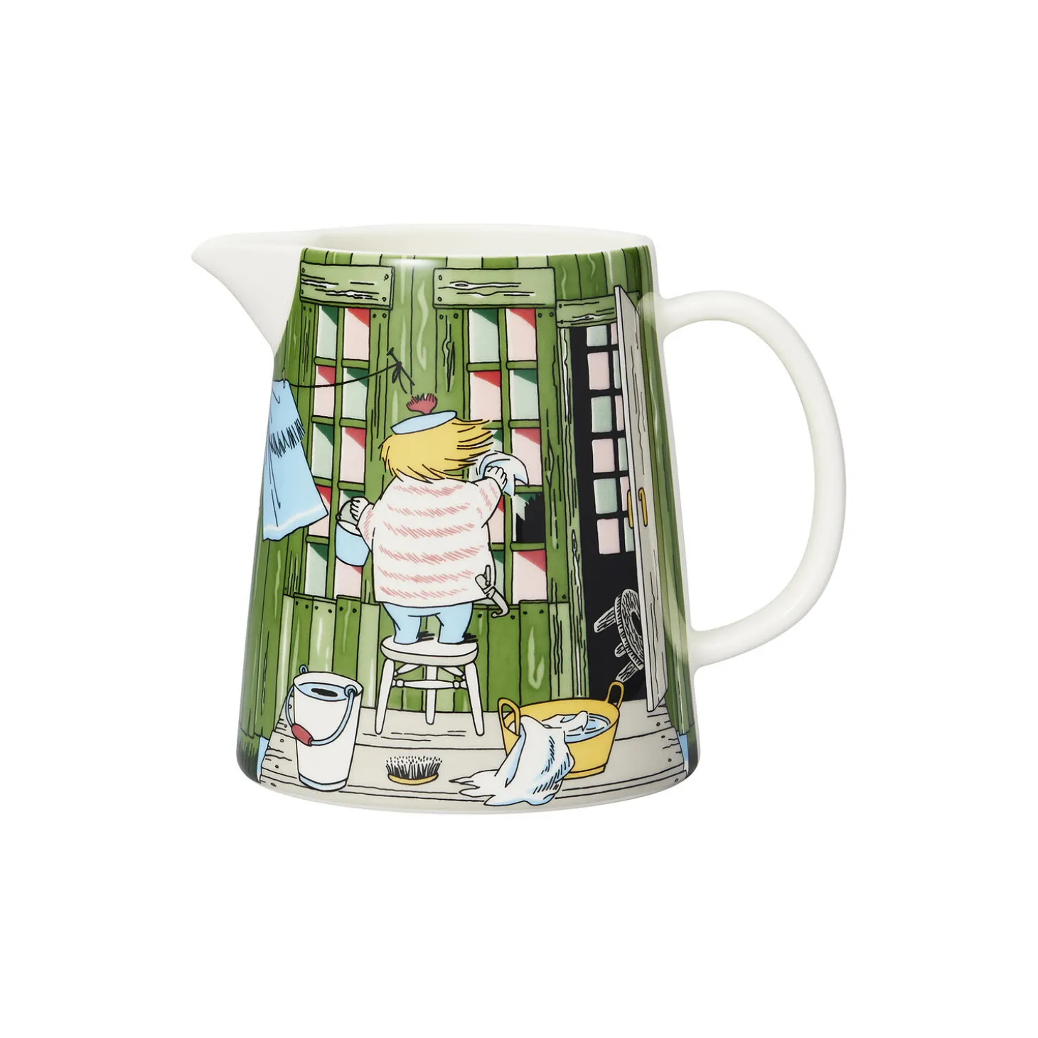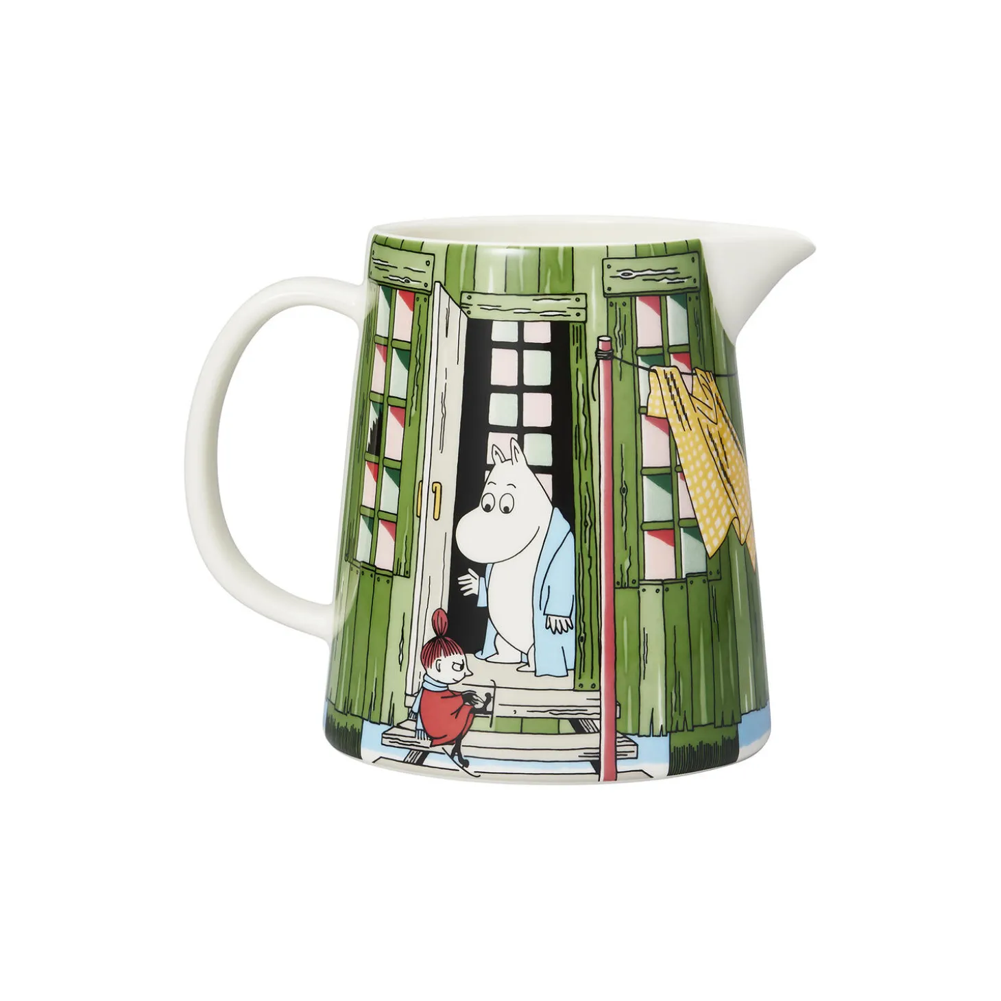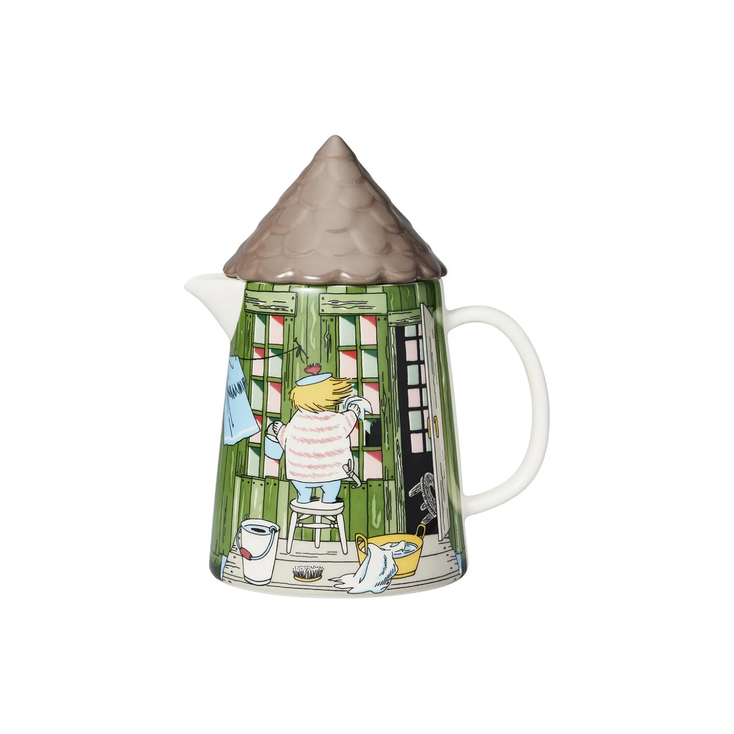 Mumi kande Bådhuset i porcelæn fra Moomin Arabia. Farve: grøn/brun. Indeholder: 1 L. Design: Tove Slotte.