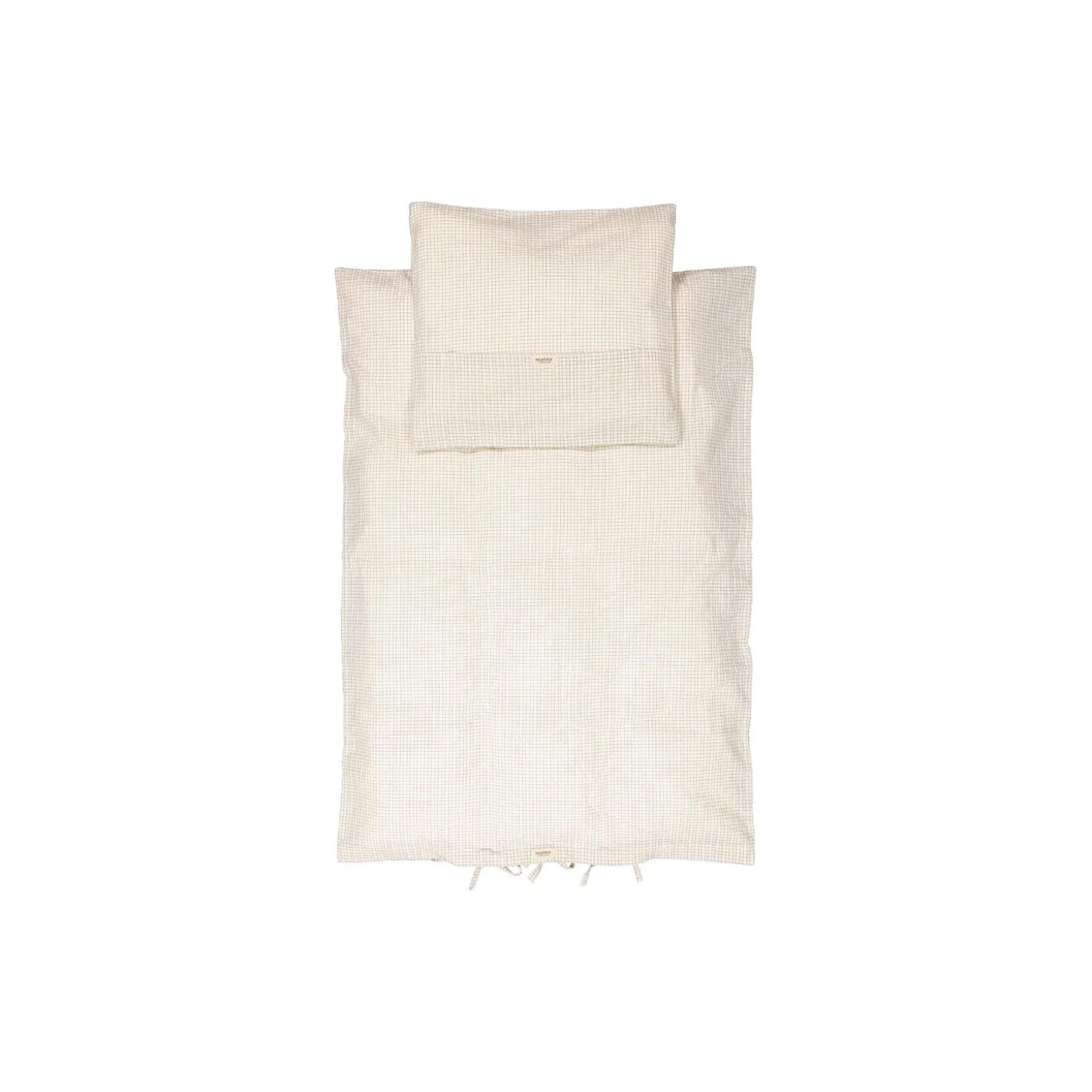 Sengetøj med betræk til dyne og hovedpude. Dynebetrækket lukkes med bindebånd i fodenden.