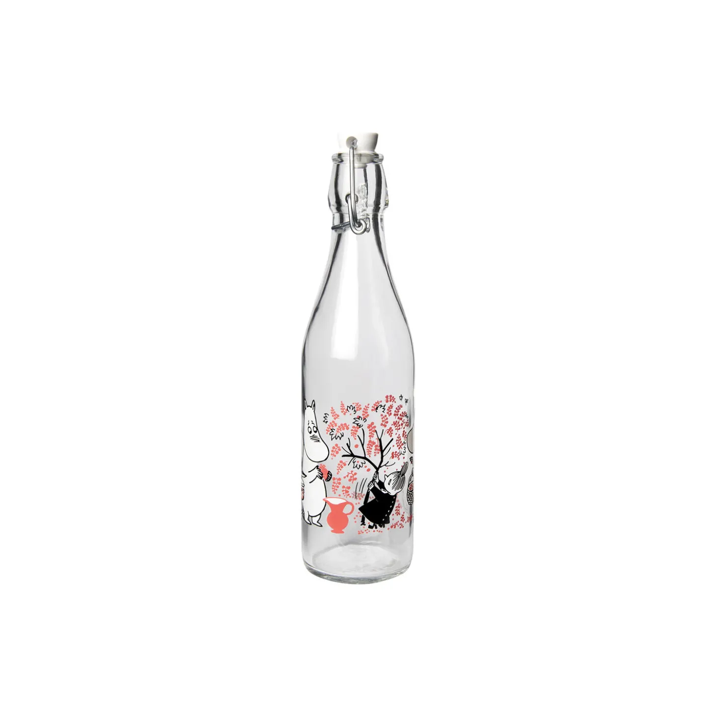 Smuk lille patentflaske med mumitroldene, lille my og hunden ynk der plukker bær. Flasken rummer 0,5 liter. Mumitroldene glasflaske med patentlukning og motiv, kan bruges som drikkeflaske eller til servering på havebordet, til morgen, middag eller aftensmaden.