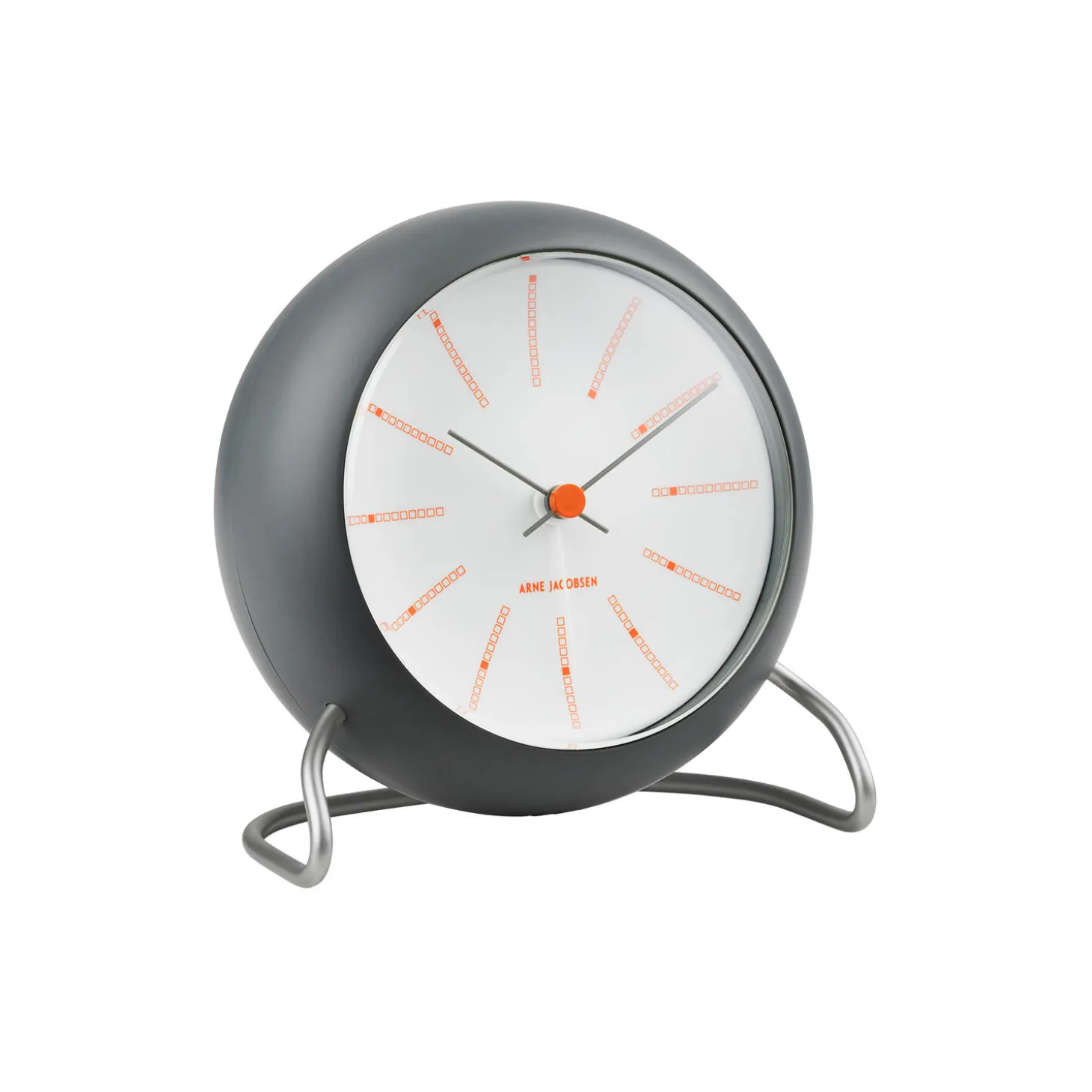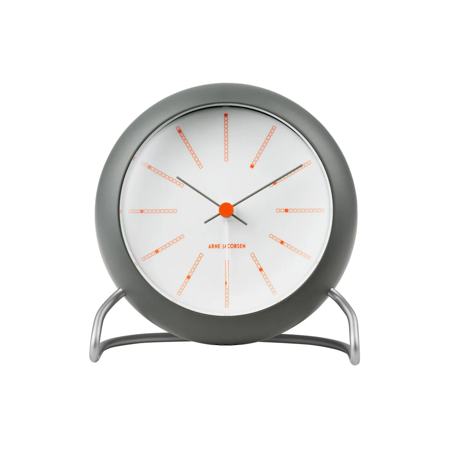 Arne Jacobsen var kendt som en arkitekt som lavede total design npr han tegnede bygninger. I 1971 tegnede Arne Jacobsen Nationalbanken i København. Til den smukke marmor beklædte bygning, tegnede Arne Jacobsen Bankers uret. Designet var moderne for sin tid og er det stadig. Den grå matte overflade pp uret er en hyldest til Arne Jacobsens favorit materiale, det grå marmor som National Banken er beklædt i. De orange detaljer er n moderne fortolkning af den røde prik.