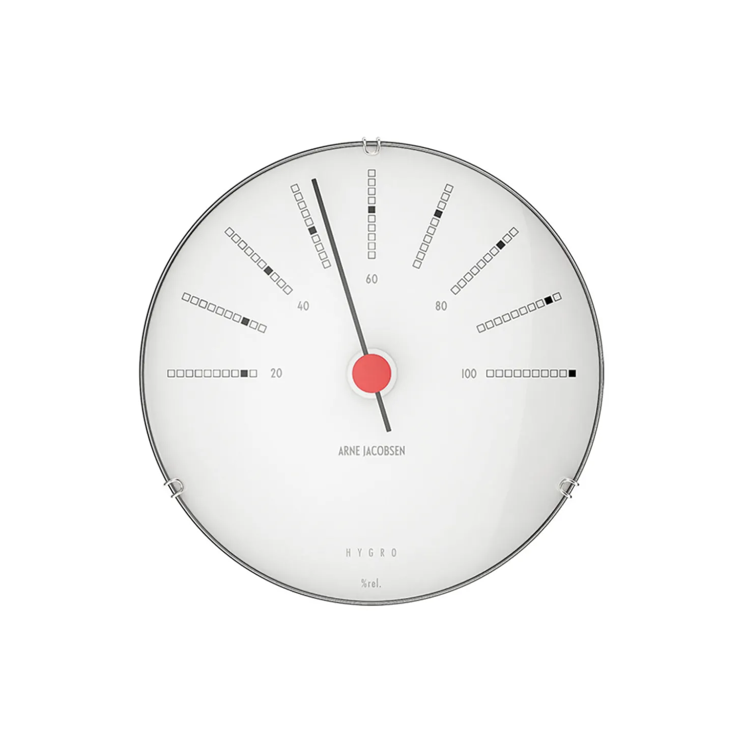 Arne Jacobsen vejrstationen giver ikke kun et overblik over luftfugtighed, temperatur, lufttryk og tiden – vejrstationen er også smuk, enkel og dansk design til væggen. Den danske og internationalt anerkendte arkitekt Arne Jacobsen har sat sit markante aftryk på alt fra arkitektur til interiør, møbeldesign og grafik. Arne Jacobsen fremstår i dag stadig, som en af verdens førende modernister. Blandt Arne Jacobsens markante bygninger er Nationalbanken (1971), hvortil han skabte væguret Bankers. Inspirationen til de nye vejrstationer er fundet i dette ur. Vejrstationen består af vægur (tid), Barometer (lufttryk), Hygrometer (luftfugtighed) og Termometer (temperatur). Alle måler Ø 12 cm.