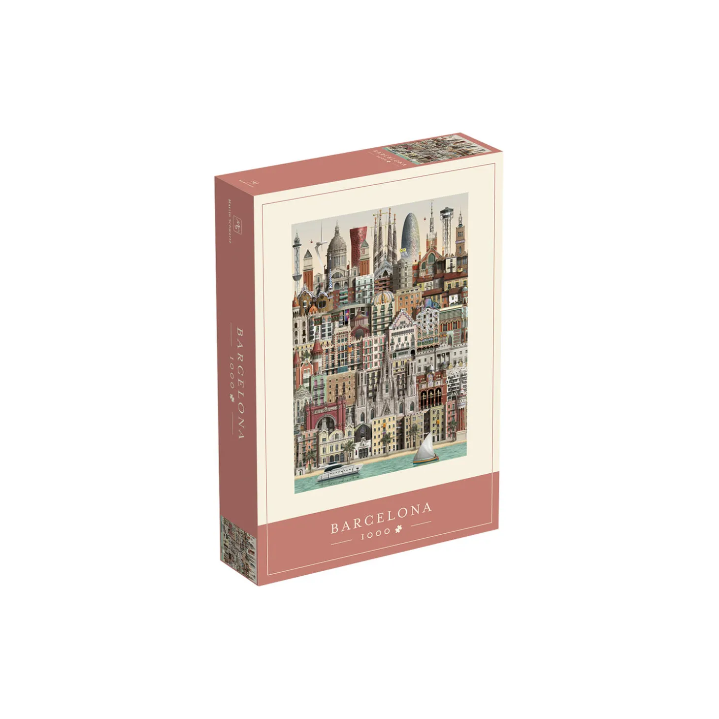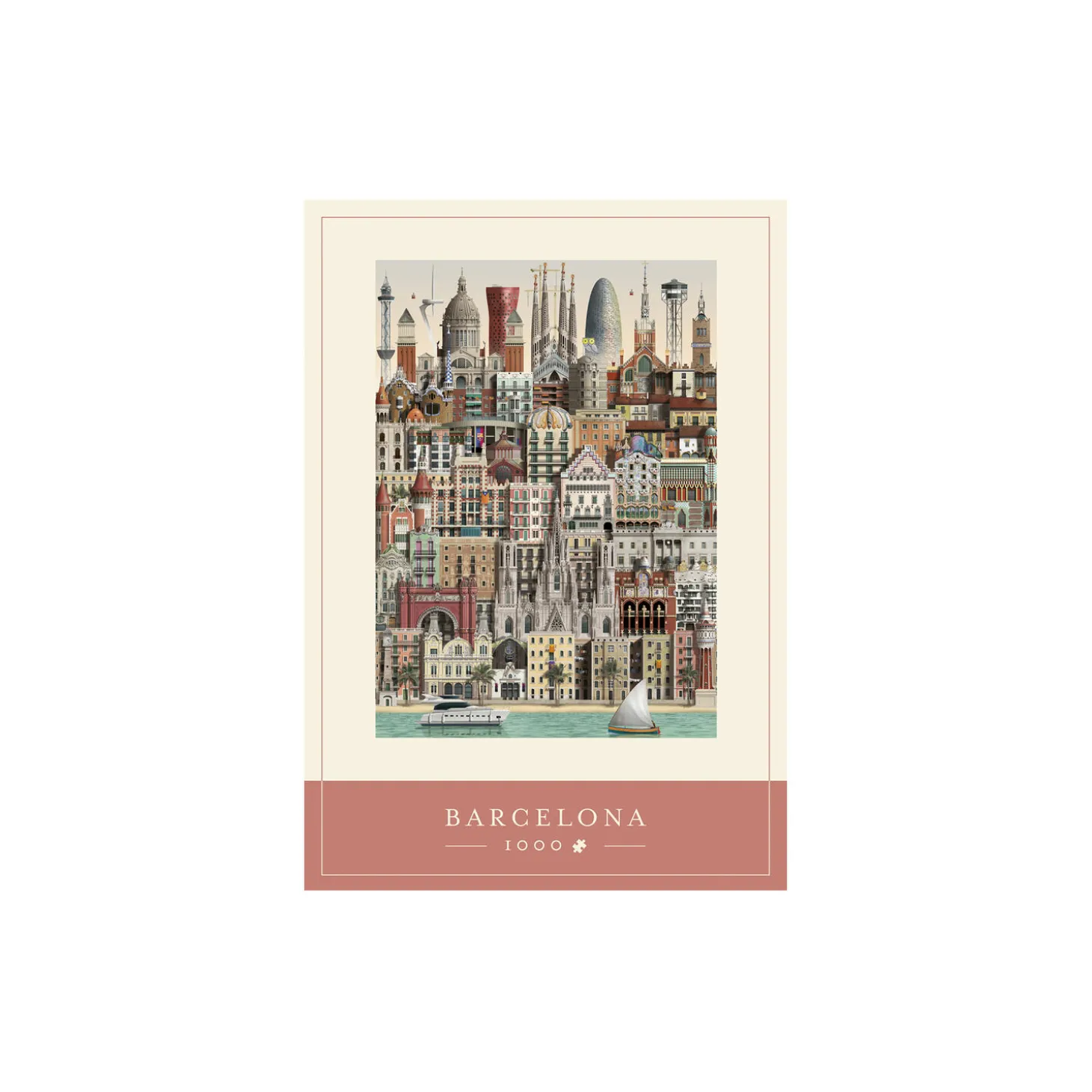 Barcelona puslespil trykt på pap fra Martin Schwartz. Farve: multifarvet. Mål: 50×70 cm. Antal: 1000 brikker.