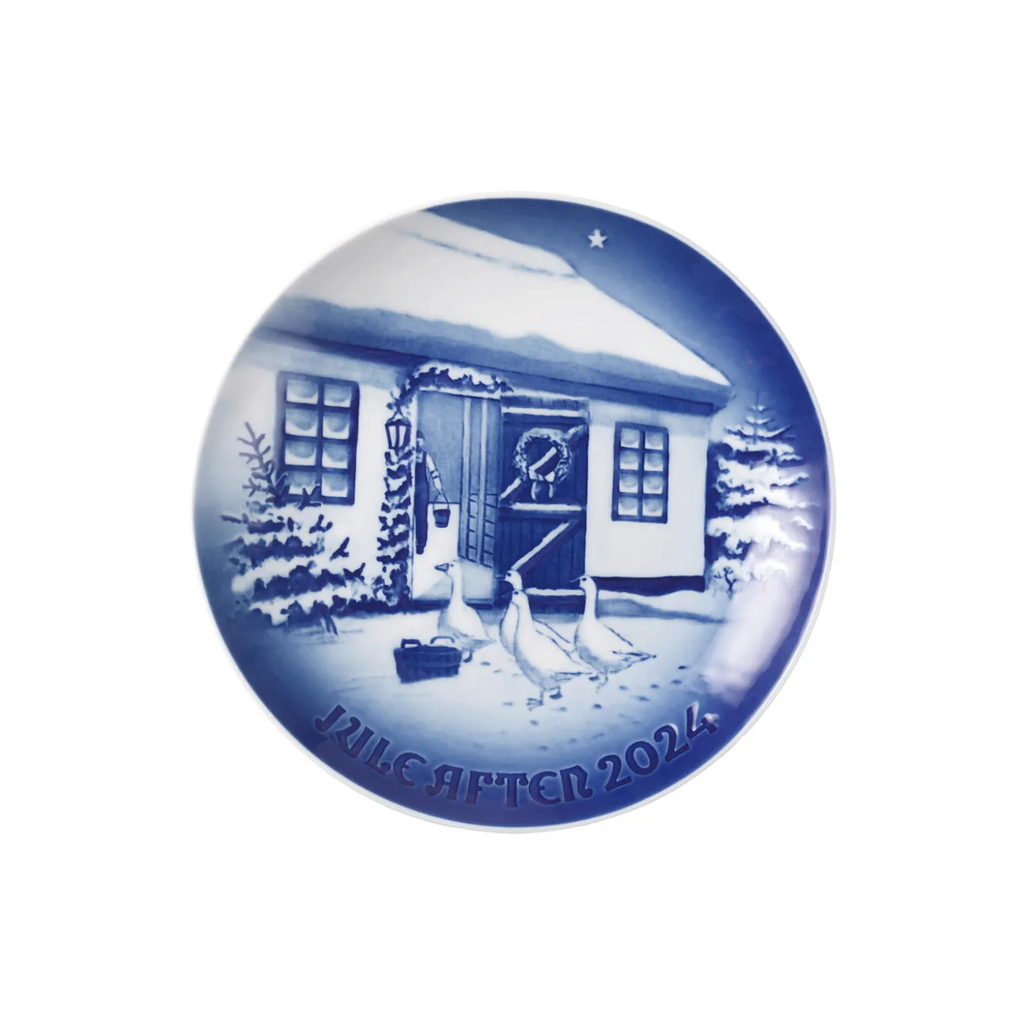 Titlen på Bing & Grøndal Platten 2024 er ‘Jul på landet’, og platten afbilder en hyggelig lille scene, hvor gæssene har hørt bondemanden i laden, og de venter nu spændt på at blive fodret. Som altid er illustrationen på årets platte designet af Dag Samsund.