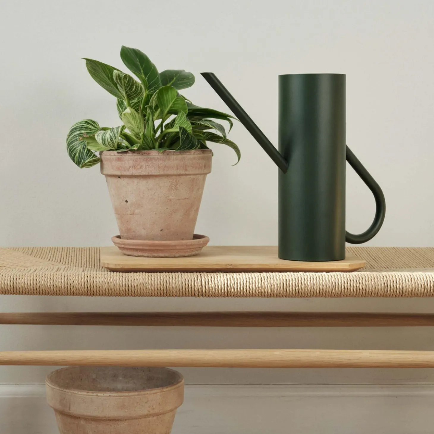 Bloom er en stilren blomstervandkande produceret i pulverlakeret rustfrit stål, med en mat overflade, i en flot, dyb mørkegrøn farve (Pine). Bag designet står den tyske designduo Böttcher & Kayser, hvis mål er at skabe enkle, originale produkter uden overflødige detaljer. Det er det tidløse og styrken ved cylindriske former, der har inspireret den tyske designduo til at skabe denne moderne fortolkning af en klassisk vandkande, med et hint til formgivningen på EM77 termokanden, der er en stor del af Steltons historie. Med sit enkle formsprog, hvor hank og tud ser ud til at gå i ét igennem kanden, forenes æstetik med funktionalitet, da vandkanden ud over sin egentlige funktion også er dekorativ at have stående fremme. Den lange, tynde tud gør det nemt at vande selv helt små krukker uden at spilde, og det intelligente design sikrer, at vandkanden er drypfri. Under bunden på kanden sidder en rillet silikonemåtte, der gør kanden skridsikker.