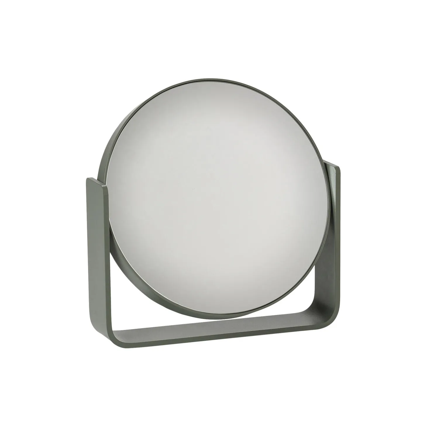 Uundværligt bordspejl, der pynter, hvor end du placerer det. Den ene side er almindeligt spejl, mens den anden forstørrer hele fem gange. Spejlet roterer sikkert om egen akse, da det bæres af en bred aluminiumsramme, som samtidig udgør spejlets stabile base. Det er pulverlakeret og har et fint mat look. Spejlet glider smukt ind i den populære UME-serie og fås i alle 7 farver: Black, White, Soft Grey, Grey, Eucalyptus, Taupe, Olive Green.