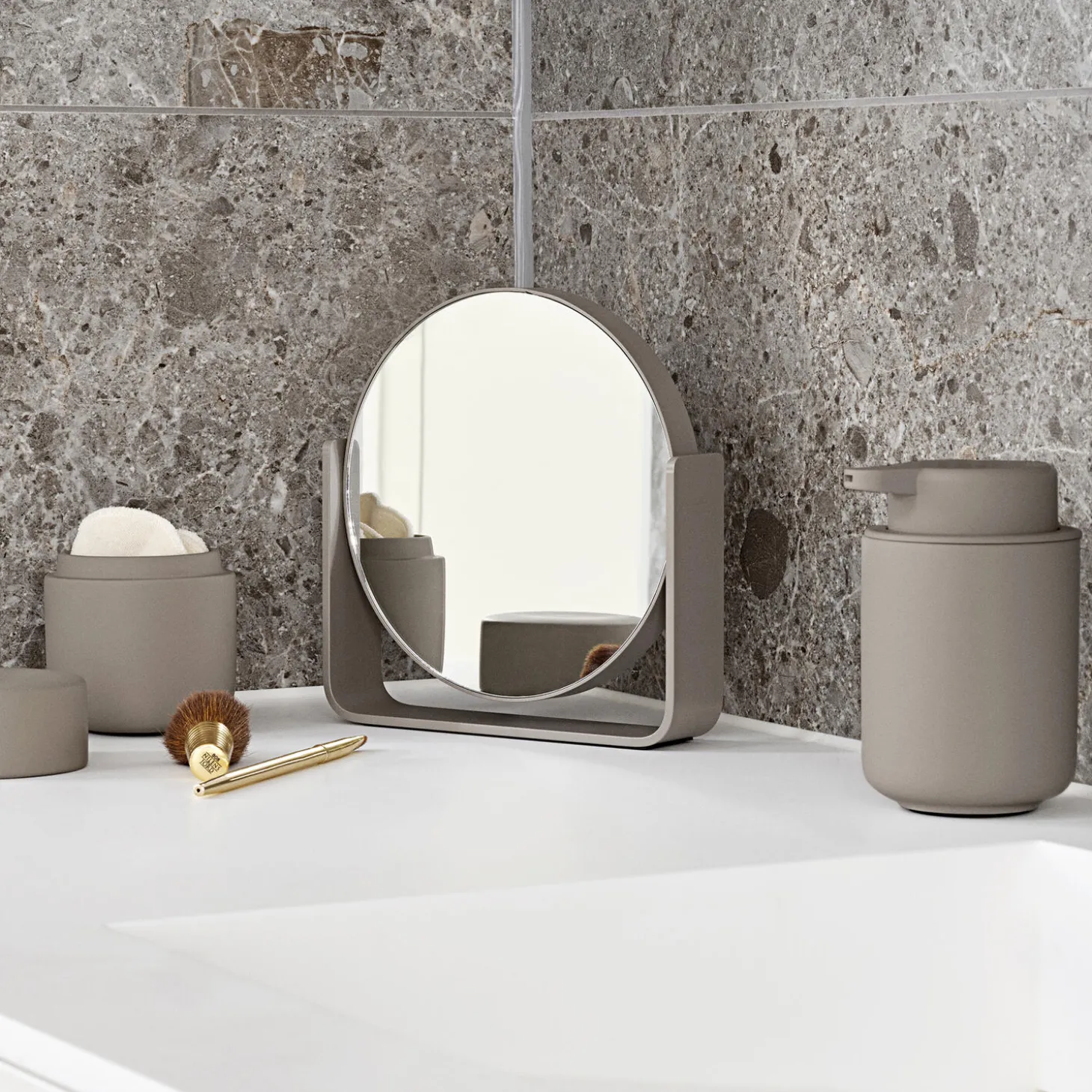 Uundværligt bordspejl, der pynter, hvor end du placerer det. Den ene side er almindeligt spejl, mens den anden forstørrer hele fem gange. Spejlet roterer sikkert om egen akse, da det bæres af en bred aluminiumsramme, som samtidig udgør spejlets stabile base. Det er pulverlakeret og har et fint mat look. Spejlet glider smukt ind i den populære UME-serie og fås i alle 7 farver: Black, White, Soft Grey, Grey, Eucalyptus, Taupe, Olive Green.