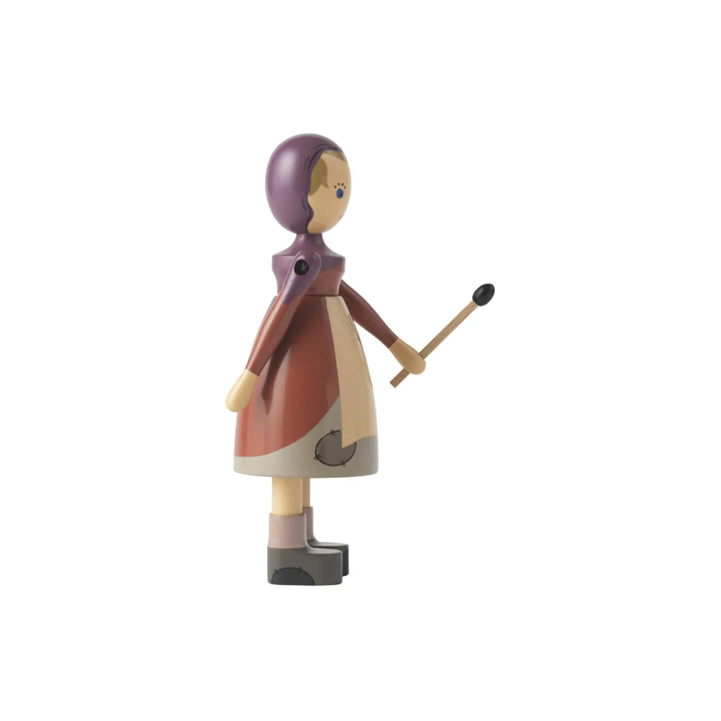 Lad eventyret leve videre gennem originale fortællinger i træ. I Odense åbnede i 2021 museet H.C. Andersens Hus, og i den forbindelse indledte museet og Kay Bojesen Danmark et samarbejde, så det nu ville være muligt at finde nogle af de mest kendte og elskede figurer fra de verdensberømte eventyr fortolket i Kay Bojesens univers af originale fortællinger i træ. Nattergalen, Hyrdinden & Skorstensfejeren og Ole Lukøje var de første til at flytte ind på hylderne i museumsbutikken i Odense – og selvfølgelig også i din lokale designbutik. Og nu har Den lille Pige med Svovlstikkerne også fundet ind i varmen. I Kay Bojesens fortolkning er hun iklædt en hætte, der går ned over skuldrene. Hun har lapper på kjole og forklæde, som er holdt i nedtonede farver, der understreger, at den lille pige kommer fra fattige kår. Hendes lune smil og milde og uskyldige udtryk er affødt af de smukke oplevelser, hun ser for sit indre blik i lyset fra flammerne, hvor hun en kold nytårsaften får vækket fantasien med nogle fantastiske drømmesyn fyldt med glæde og tryghed. I hånden holder hun en svovlstik, der fuldender fortællingen. Den Lille Pige med Svovlstikkerne måler 14,5 cm i højden og er drejet i FSC®-certificeret bøgetræ, og den manuelle produktion med maling og tryk er udført med den store præcision og omhyggelighed, der kendetegner træfigurerne fra Kay Bojesen. Formen er baseret på den originale Lise-figur fra Kay Bojesens arkiv, der er enkel og minimalistisk, men fuld af liv og sjæl. Det giver Den Lille Pige med Svovlstikkerne den følelse af magi og eventyr, der er i tråd med Kay Bojesens ånd og den historiefortælling, han formåede at skabe, når han designede sine fantasifulde figurer.