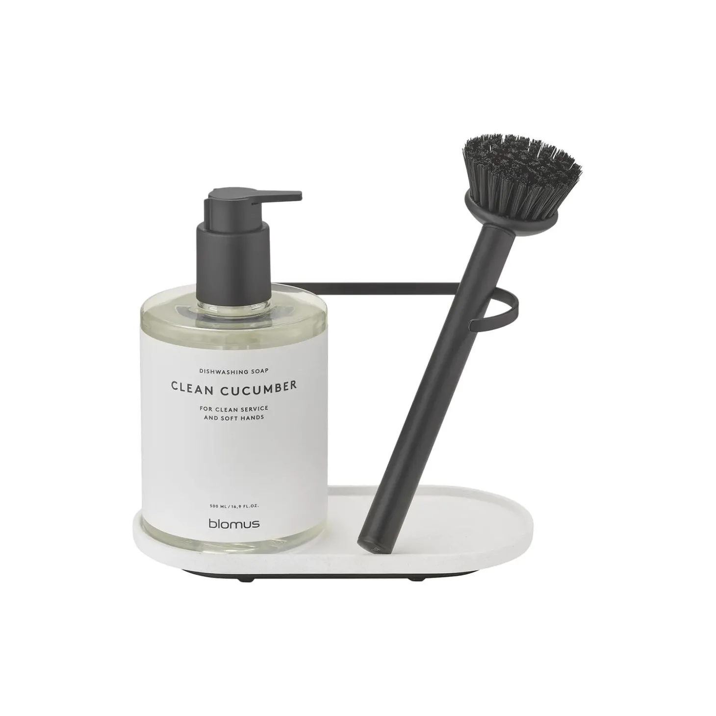 DHUVA – Det ideelle sæt til dem, der sætter pris på orden og stil i køkkenet. Den robuste betonbase, der er beskyttet af en PU-forsegling, giver den perfekte overflade til blomus SATOMI opvaskemiddel. Silikonepuder sikrer en sikker stand og beskytter din bordplade. Den elegante metalramme af pulverlakeret stål giver praktisk opbevaring af karklude og ARJA-opvaskebørsten af høj kvalitet med udskifteligt hoved, som er inkluderet i sættet. Børsten imponerer med et ædelt, pulverlakeret håndtag i rustfrit stål. Det udskiftelige plasthoved og de mellemhårde polypropylenbørster garanterer grundig rengøring og lang levetid. Fås i forskellige farver.