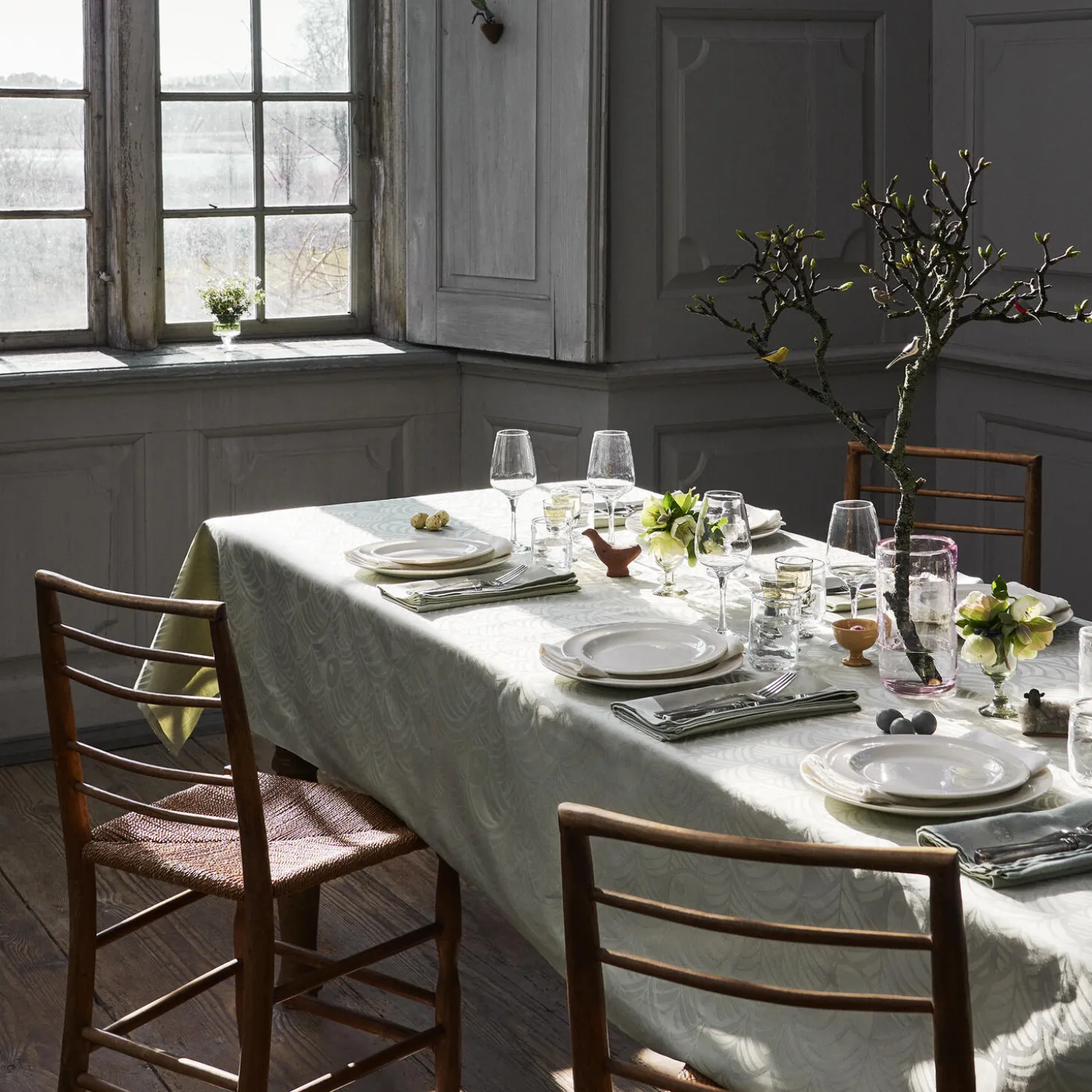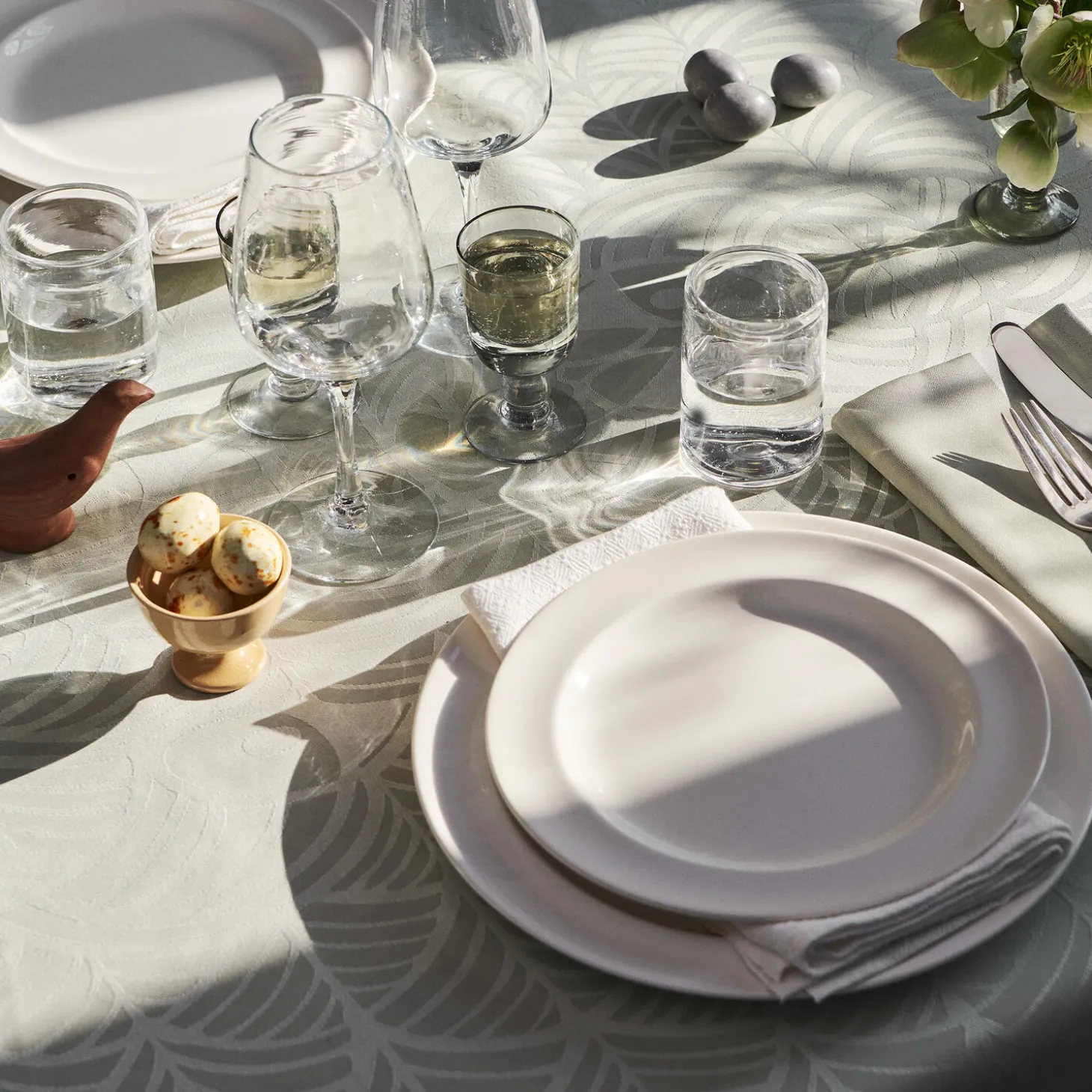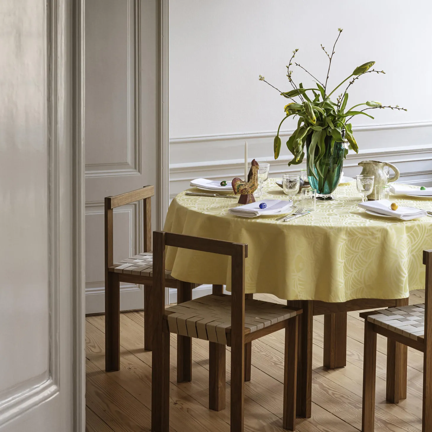 Find din påskedug frem år efter år, og lad den være midtpunkt for dine fester. Dugen i den lyse og lette farve Light Green er en sand forårsbebuder, der skaber en smuk lysegrøn baggrund for påskebordet og bringer den spirende årstid ind i hjemmet. Farven er både klassisk og moderne. Påskedugens enkle og tidløse motiv med stiliserede høns og æg er designet af Bodil Bødtker-Næss, som var en del af inderkredsen af tekstilkunstnere omkring Georg Jensen Damask i 1970’erne, og som også er ansvarlig for det klassiske julehjertemotiv, der er et signaturmotiv i kollektionen. Lad den lysegrønne dug samle generationer omkring bordet i højtiden år efter år – som en del af påskens traditioner.