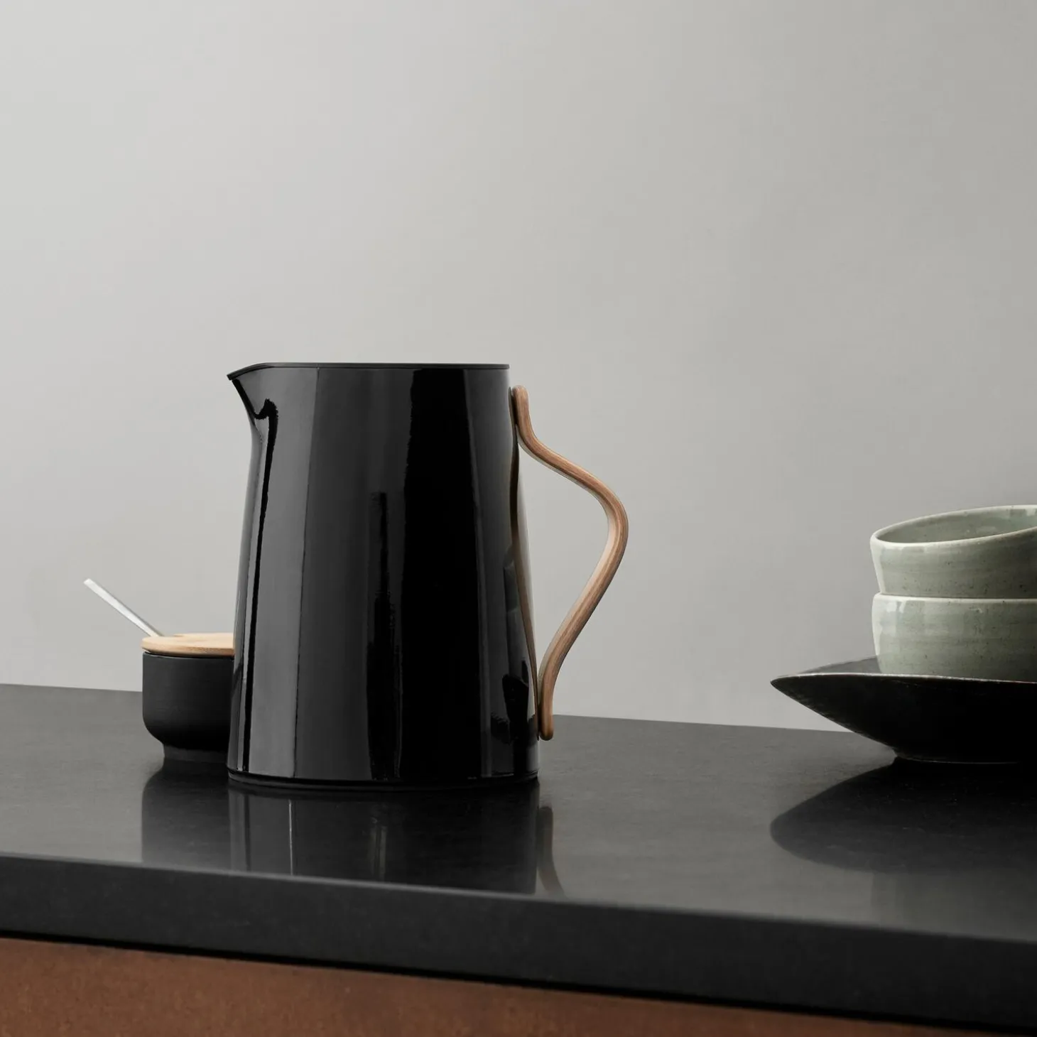 Emma seriens revolutionerende te-termokande i lakeret rustfrit stål med stålindsats og indbygget tefilter sætter nye standarder for te-brygning. Med et enkelt twist på låget lukkes det indbyggede smart-filter og teen stopper med at trække. Kanden, der indeholder 1 l., er designet af HolmbäckNordentoft i et moderne, skandinavisk design, der kombinerer højglanslakeret stål i dyb sort med en hank i bøgetræ. Emma serien – en smuk designklassiker til hverdagen.