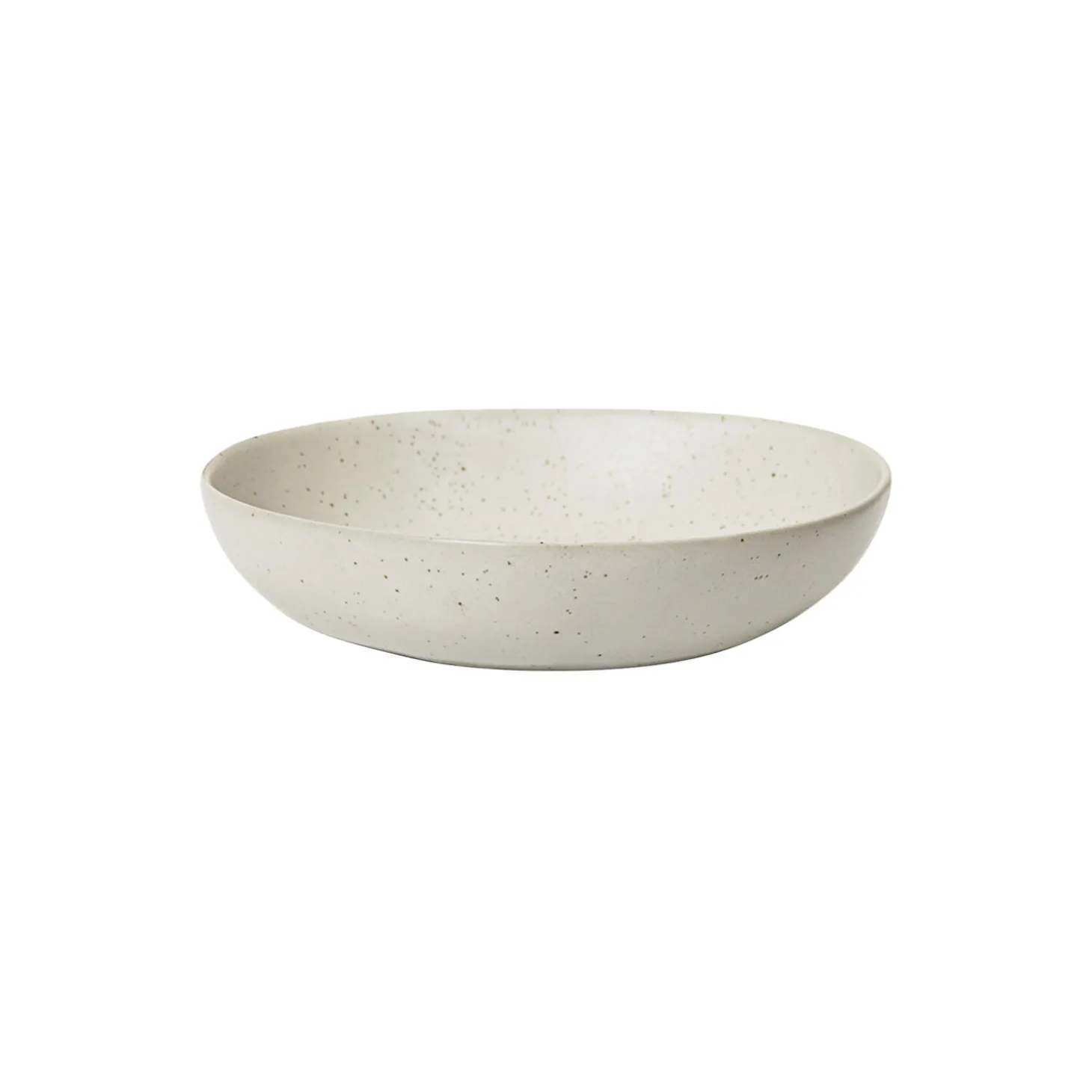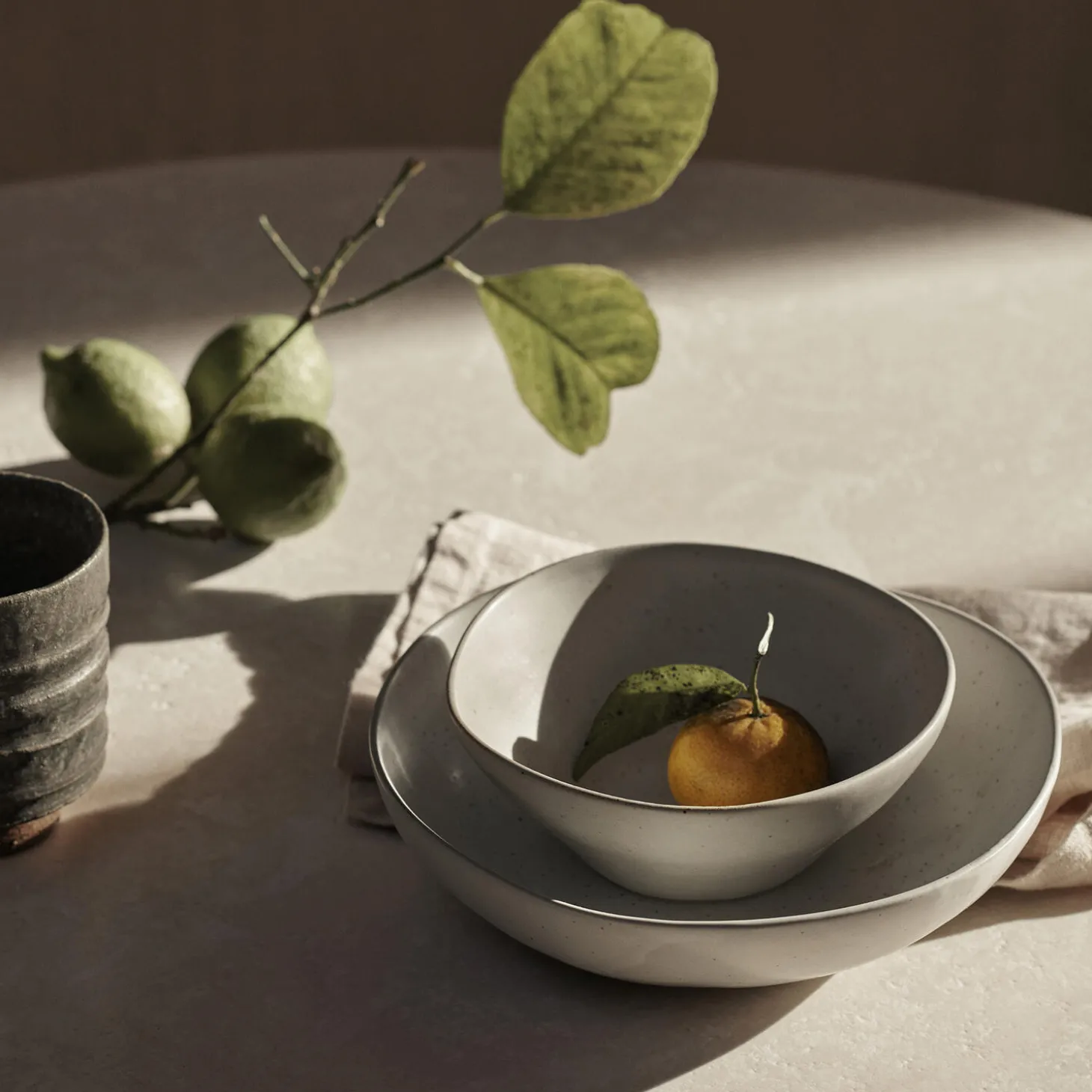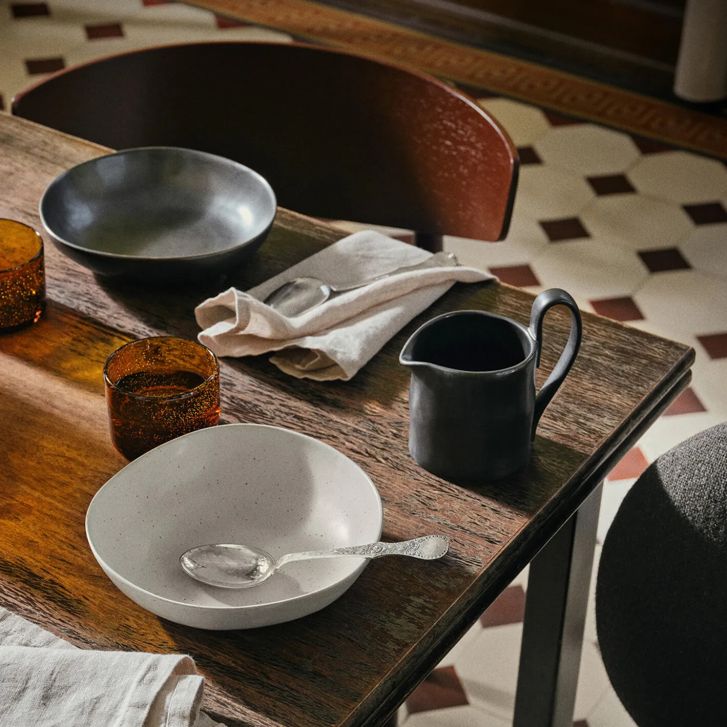 Flow er en serie af service med en moderne æstetik og et rustikt design, der er skabt efter traditionelle håndværksteknikker. Alle delene er glaseret, så der opnås et unikt udtryk. Denne store, alsidige skål med en kunstfærdig ujævn kant er perfekt til servering af salater, supper eller snacks.