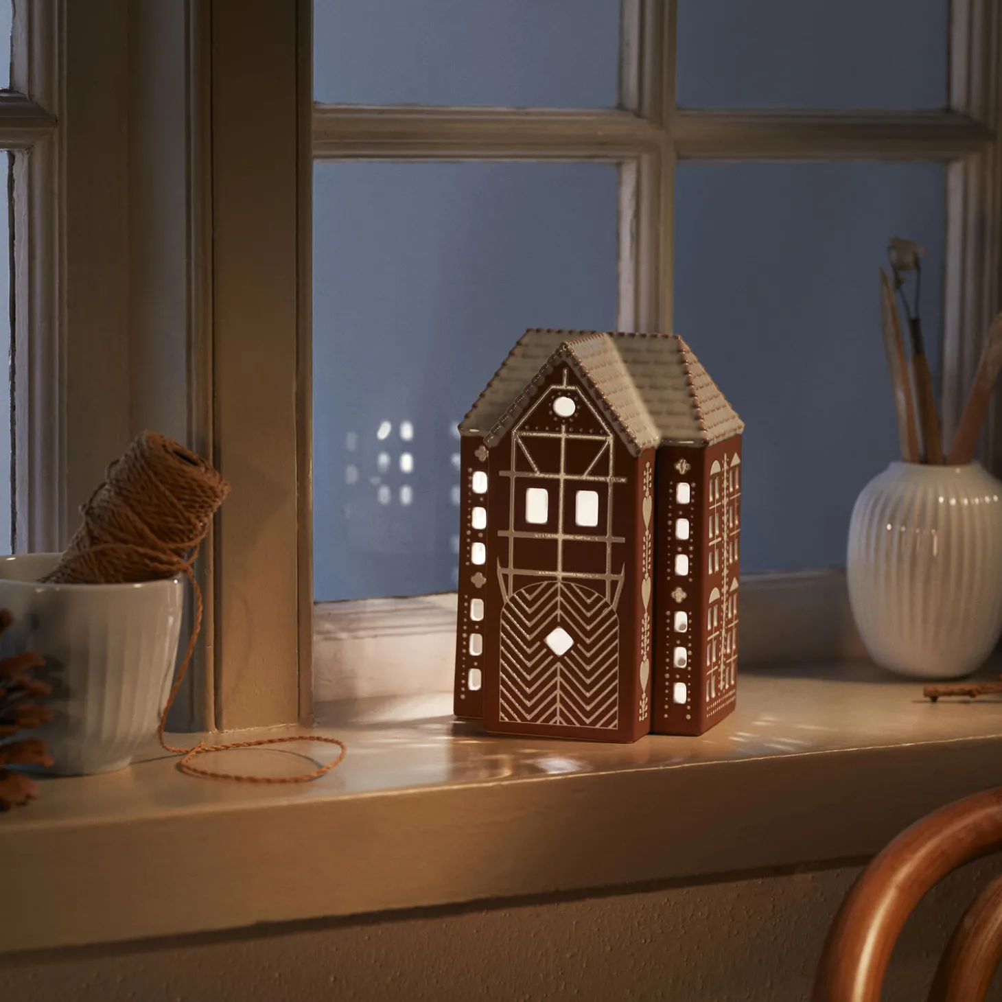 Kähler Gingerbread er en serie af håndlavede honningkagehuse, hvor Kählers keramiske ophav og den danske jul er sat på en fælles designformel. Dette honningkagehus emmer af jul, charme og traditioner og er med sine 17 cm i højden det største af honningkagehusene. Husets forside er belagt med et fint bindingsværkmønster, et cirkelformet og smukt dekoreret vindue og en stor port, der inviterer indenfor til masser af autentisk varme og hygge. Siderne på lyshuset er pyntet med store, hvide hjerter som symbol på den kærlighed, der ligger i hjerternes fest – julen. Skab et hyggeligt julelandskab med nisser omkring husene eller brug dem alene som håndlavede designelementer, der med deres blanke og taktile glasur og den rå, uglaserede keramik vil stå smukt og sprede hygge. Gingerbread-lyshusene har en brun, mat yderside, der minder om honningkagedejen og er pyntet med hvide, blanke dekorationer og hvide tage, der ligner glasur. Og som en vigtig detalje er honningkagehusene hvidglaseret indvendigt, så det varme lys fra fyrfadslyset reflekteres og skinner ud. Store som små er de alle udskåret i hånden, og lyset fra husene skaber på denne måde legende klynger af lys og skygge omkring sig, hvor end honningkagehusene placeres.