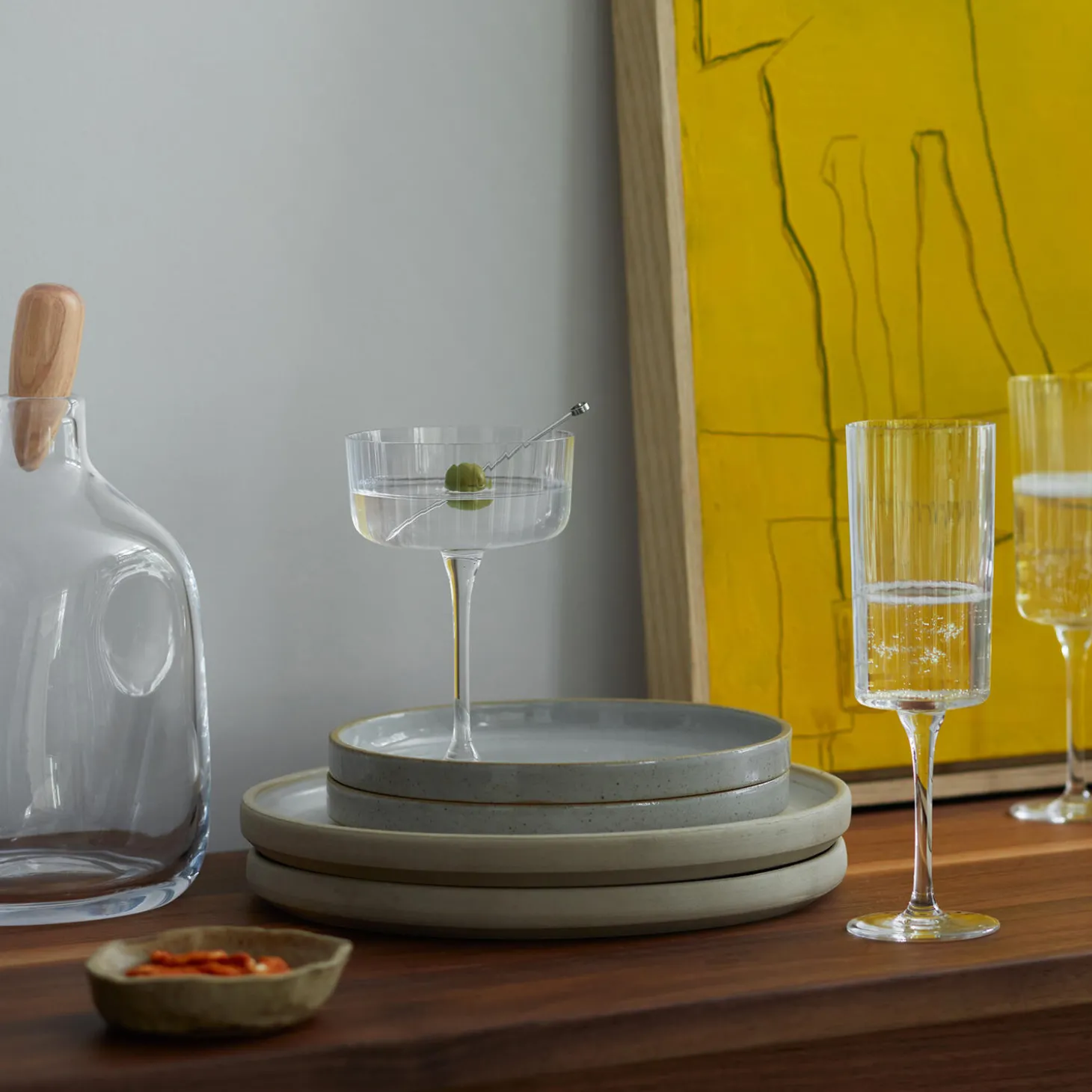 Et sæt af 4 stk. cocktail- eller champagneglas med rene linjer, bløde firkantede kanter og parrede bagsidesilhuetter. Den lineære, teksturerede finish fremhæver Gios rene, moderne design. Ideel til servering af cocktails, champagne eller prosecco.