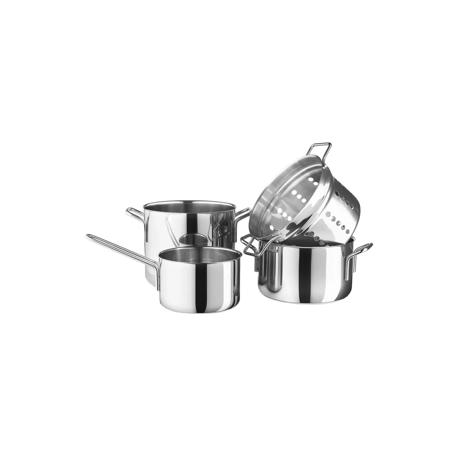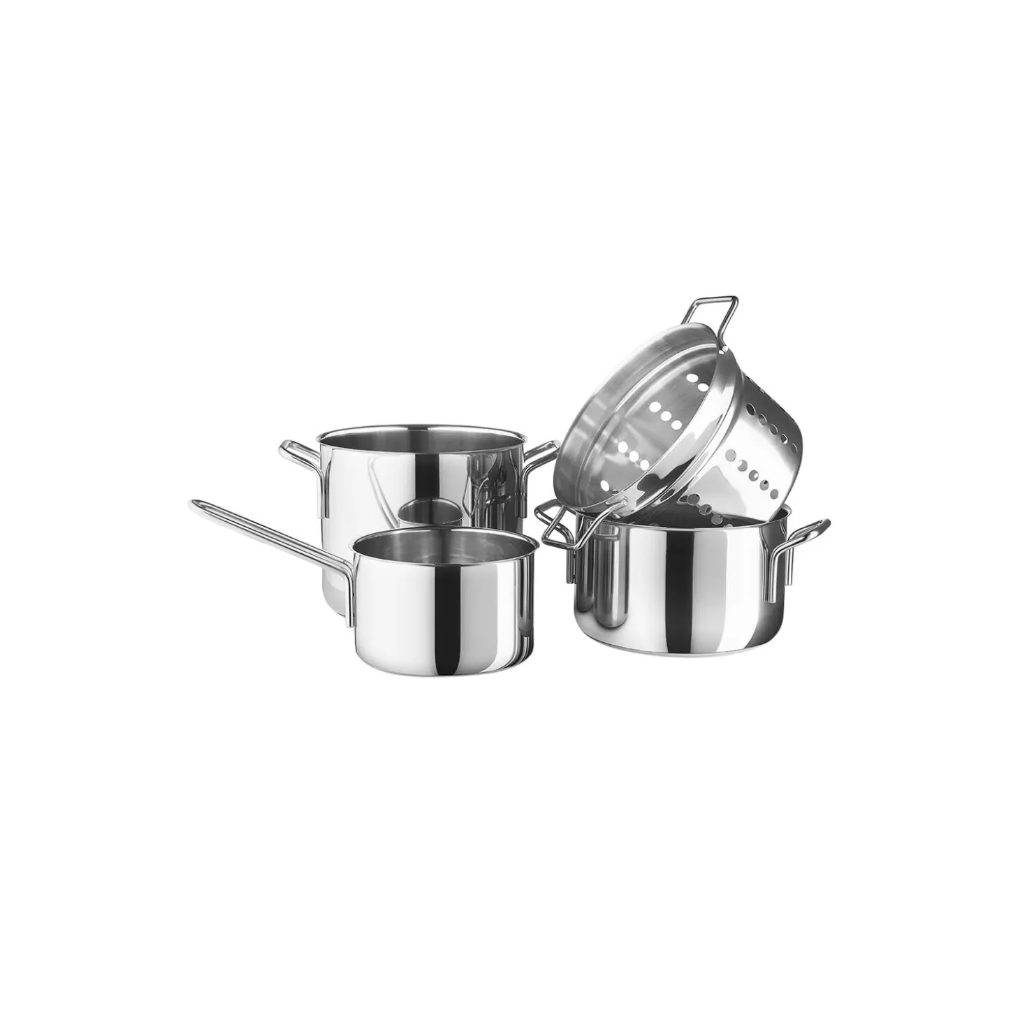 Meget anvendeligt grydesæt, med dele du ender med at bruge hver dag. Den vellykkede sammensmeltning mellem form og funktion, har gjort den rustfrie serie af kogegrej fra Eva Trio til moderne designklassikere. Gryder fremstillet i rustfrit stål er robuste og tåler høj varme. Stål er desuden modstandsdygtigt over for madsyre, og er et godt valg til det daglige brug af gryder. Sættet indeholder: Kasserolle 1,1 L, Gryde 2,2 L, Gryde 3,6 L, Pastaindsats