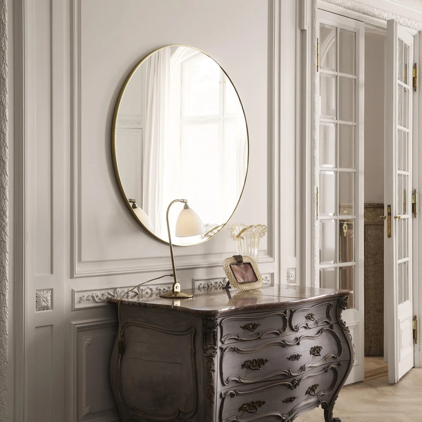 GUBI Wall Mirror Round i messing og spejlglas fra GUBI. Farve: polished brass. Mål: D: 2,7 x Ø 110 cm. Design: GUBI.