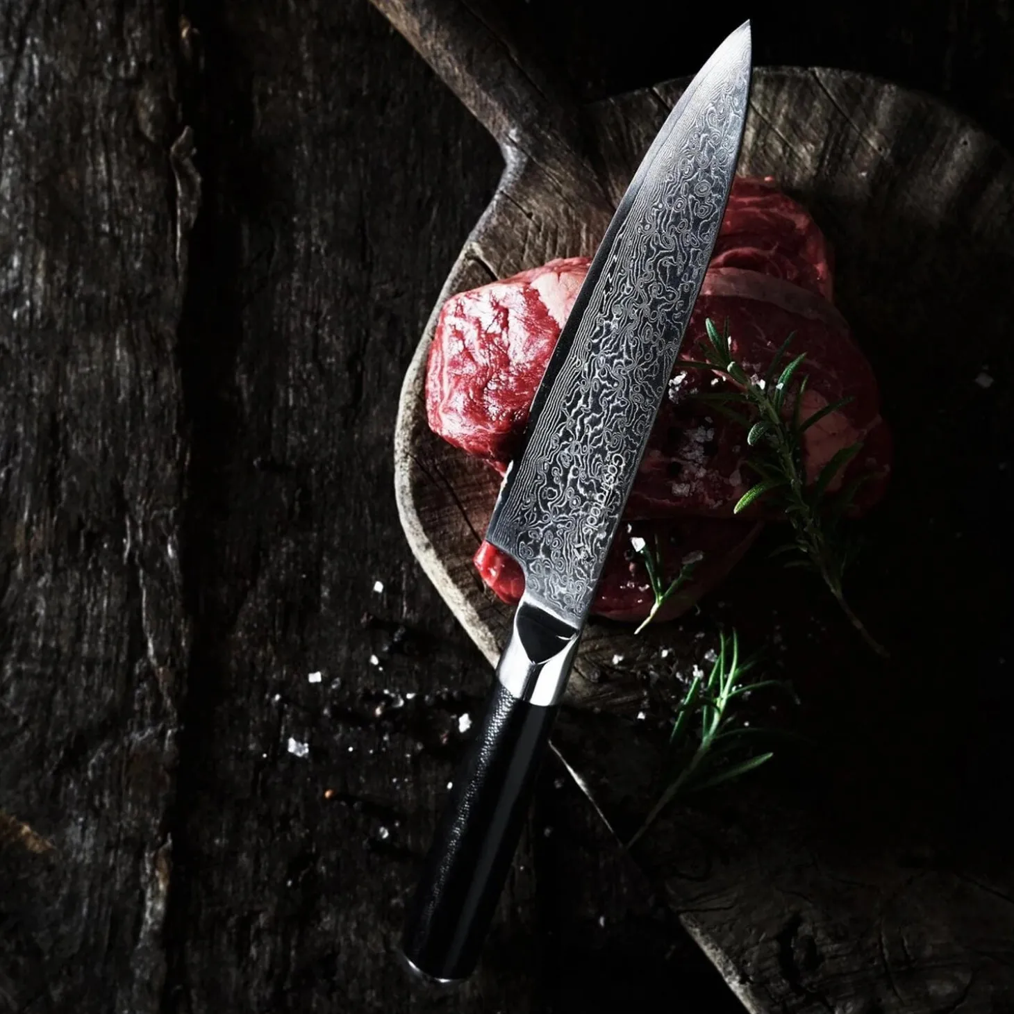 Gyuto kokkekniv i 67 lag japansk stål med kerne i VG10-stål fra Gastrotools. Knivblad: 21 cm.
