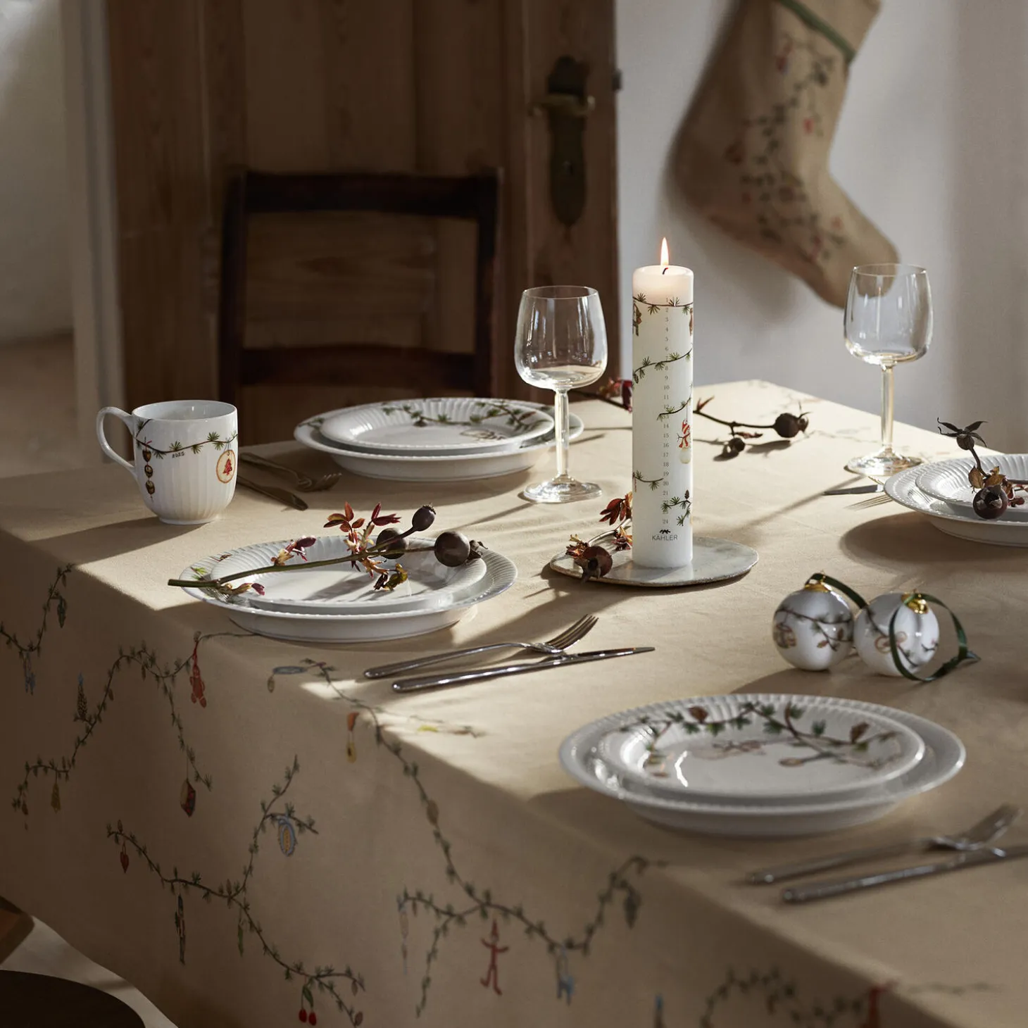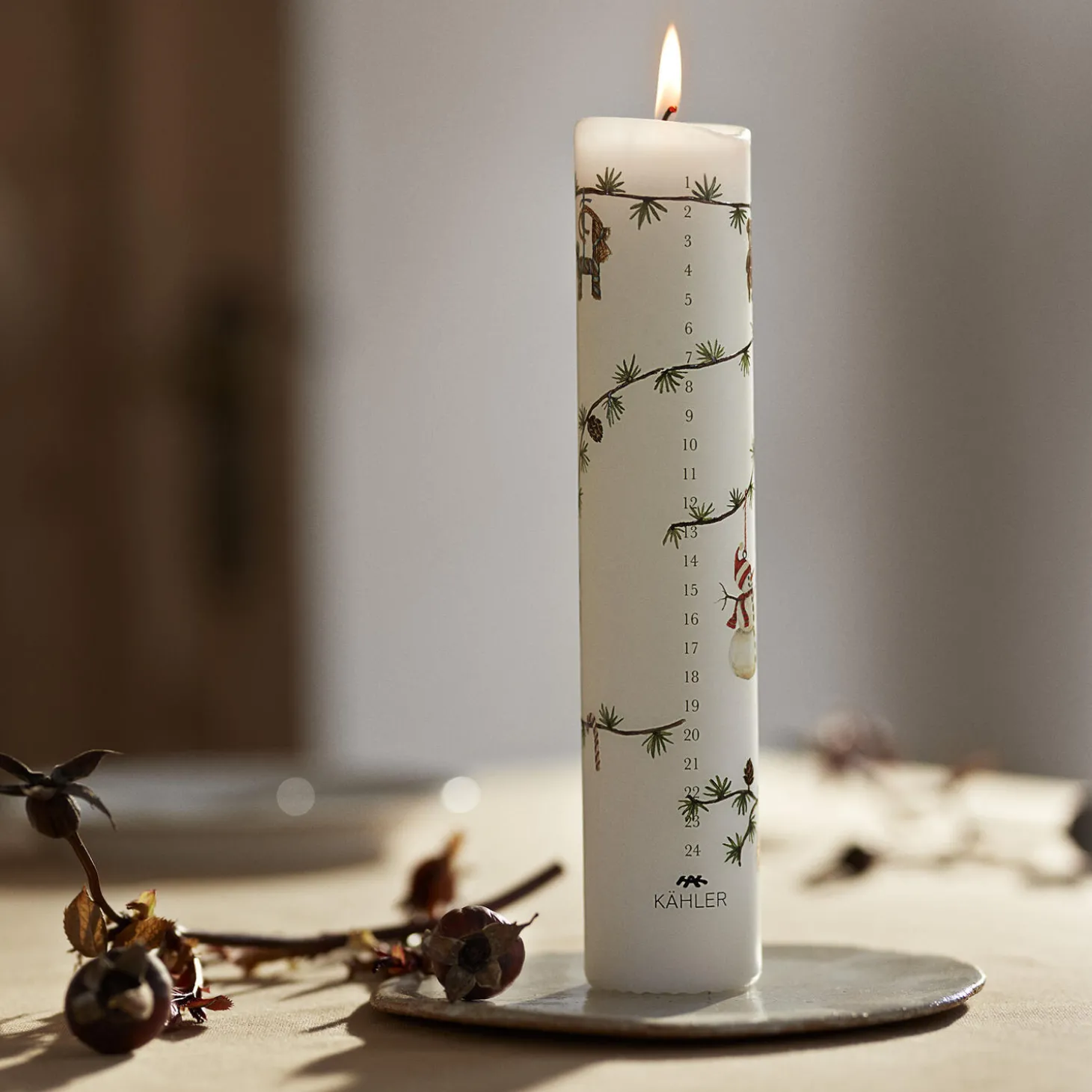Træd ind i julens magiske og fredfyldte univers med Kählers Hammershøi Christmas. Her er der roligt, trygt og nærværende med nostalgiske og klassiske julemotiver malet i akvarel af kunstner Rikke Jacobsen og overført til Hammershøi-stellet designet af Hans-Christian Bauer. Også Hammershøi Christmas-kalenderlyset 2025 er formet af tradition og fyldt med hyggelige motiver, der sørger for, at du på smukkeste vis kan tælle ned til juleaften. Kalenderlyset har en diameter på 5 cm og måler 25 cm i højden. Og i tråd med de foregående år symboliserer motiverne alt det, som Hammershøi Christmas står for. 2025-udgaven af det klassiske kalenderlys er selvfølgelig som sædvanlig udstyret med tal fra 1 til 24 og er derudover prydet af en lille julebuk med blåt silkebånd, en lille sød bamse med rødt halstørklæde, en glad snemand med rød hue og halstørklæde, en lille sovende julemus med rød nissehue, en skive appelsin hængende i en grøn snor, lidt lækkert slik og et par flettede julehjerter. Alt sammen hængt som små motiver på den velkendte cedergren med lærkekogler. Kalenderlyset er fremstillet i fuldraffineret specialvoks, der brænder smukt helt indtil den 24. december.