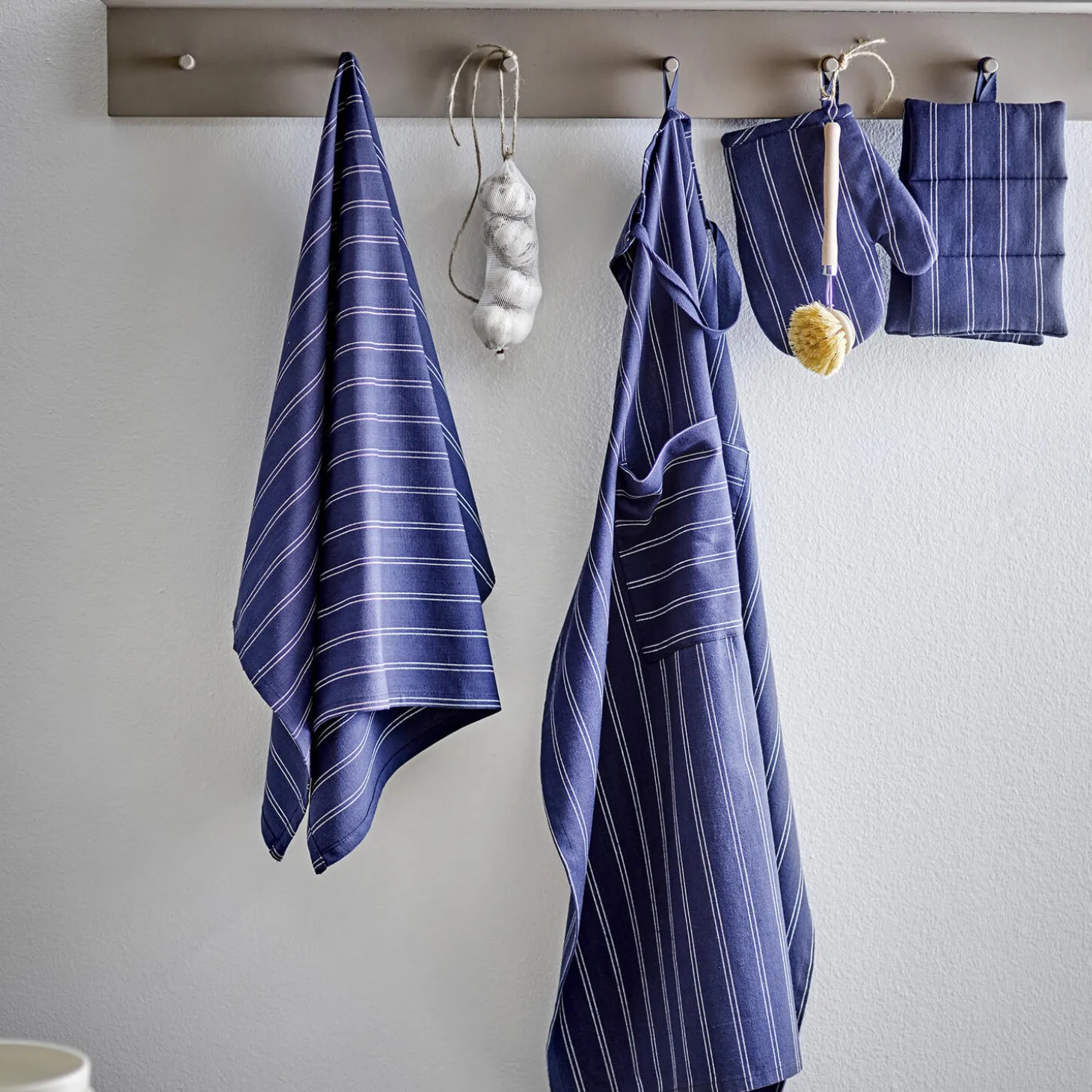 Klassisk og praktisk. Harmony-køkkenserien har et design, der aldrig går af mode, og fås i en ensfarvet udgave samt to stilfulde stribede mønstre. Serien er i genanvendt bomuld og passer ind i alle køkkener. Opgradér dit køkken med Harmony-serien, hvor tidløse produkter blandes med omtanke for miljøet. Forklædet i serien har et ensfarvet bånd i en løbegang, hvilket gør det nemt at justere. Det har også en stor lomme for ekstra funktionalitet, og desuden har forklædet en praktisk strop, så det nemt kan hænges på en krog.