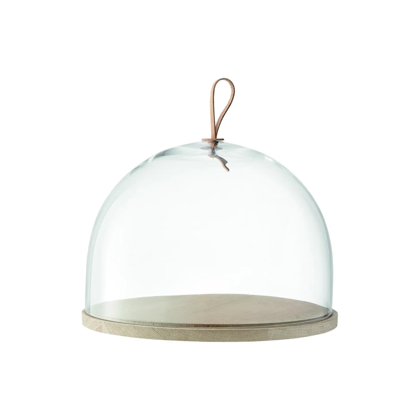 En stor, mundblæst glaskuppel med læderhåndtag på naturlig træbund lavet af bæredygtigt aske. Designet til servering af kage, oste eller bunke marengs.