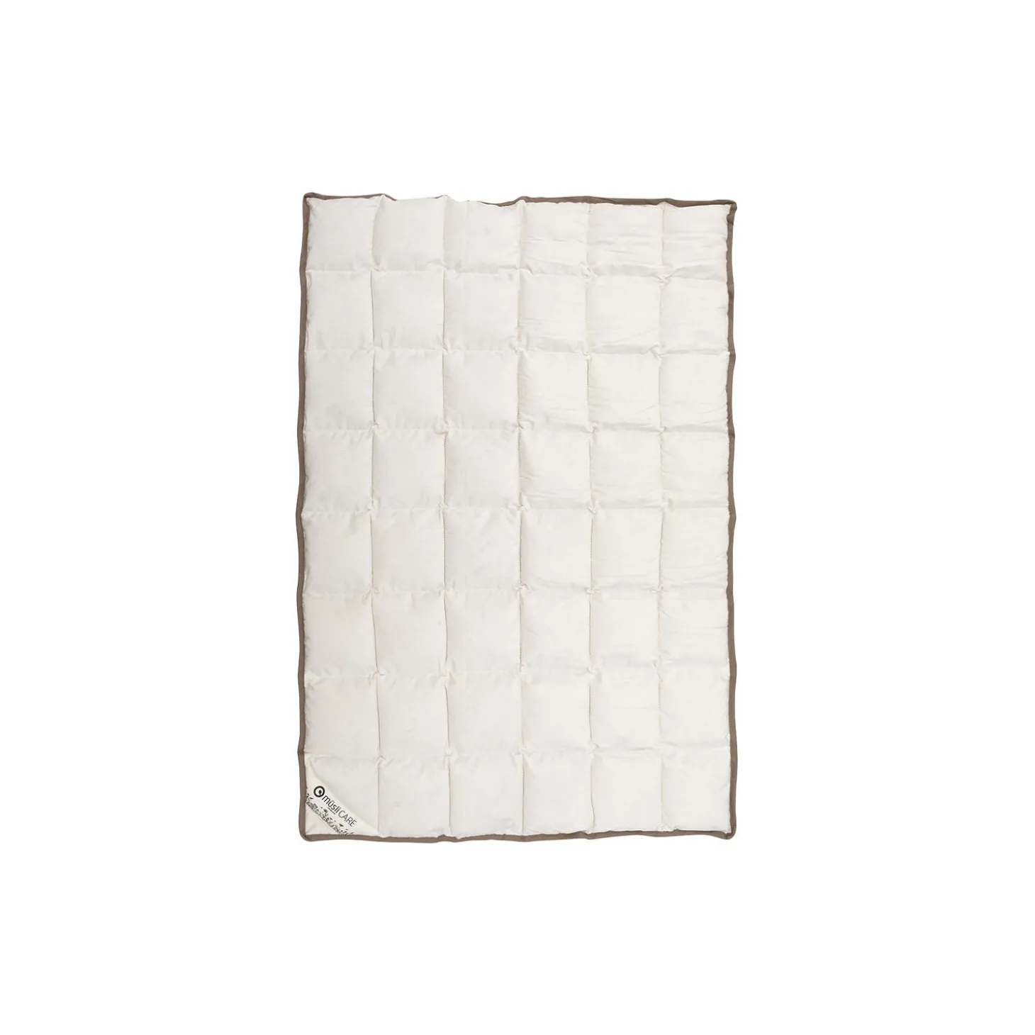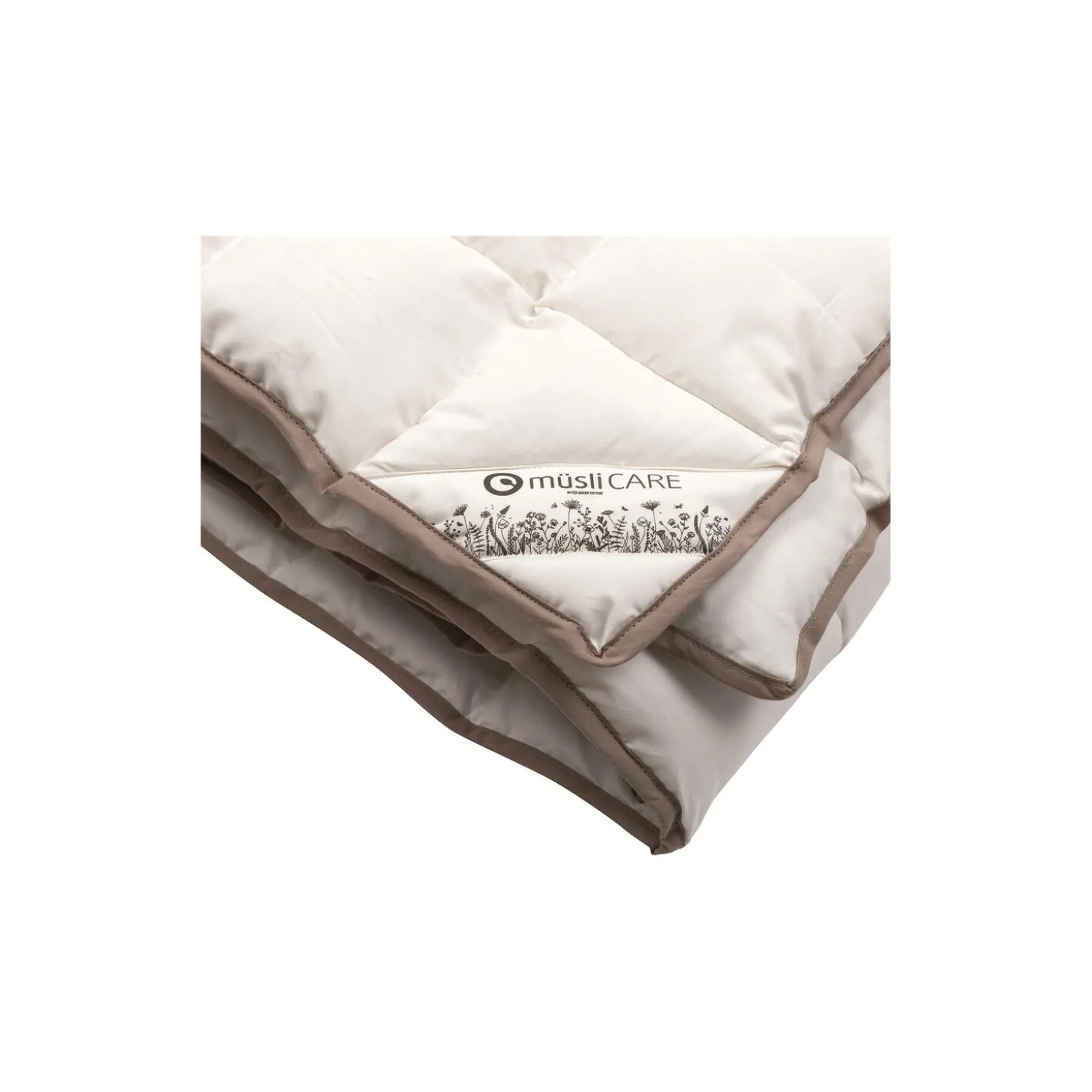 Müsli kapokdynen er lavet af rene plantefibre og er perfekt til folk med allergier. Kapok udvindes fra frøene fra kapoktræet, og er en hul fiber som består af 80% luft. Luften som er fanget i fiberen giver kapokken en fremragende isoleringsevne, og gør den til en af de letteste plantefibre i verden. Kapok er dejlig luftig om sommeren og holder på varmen om vinteren. Derudover er hver kapok fiber betrukket med naturlig voks som afviser fugt, hvilket forebygger mug og gør dem perfekt til folk med støvmideallergi. •Lavet af rene plantefibre •Afvisende over for støvmider •Isolerende •Åndbar •Kan vaskes i maskine Mål 70 X 100 cm. Tog (Thermal resistance) 3,5. ADVARSEL! Sørg for at barnets hoved ikke bliver dækket til. ADVARSEL! Må ikke bruges i forbindelse med sovepose eller tæppe. Vær altid opmærksom på rumtemperatur og barnets påklædning, overophedning kan udsætte dit barn for fare. Holdes væk fra ild. Brug ikke dynen hvis den er ødelagt kasseres ved første tegn på brud. Babydyner anbefales til vugger og babysenge med mål fra 40*90 cm. Juniordyner anbefales til tremmesenge og juniorsenge fra 60*120 cm. Må IKKE renses kemisk. Sådan behandler du din Kapok dyne: Vask kun dynen hvis det er nødvendigt. Vi anbefaler, at du vasker dynen alene ved 40 grader for at skåne kapokfibrene. Brug et skånsomt vaskemiddel uden enzymer og blegemidler. Efter vask, kan du vælge ekstra centrifugering på 1200 omdrejninger, for at få slynget mest muligt, vand ud af produktet. Brug ikke skyllemiddel. Efter vask skal dynen straks tørres. Tør din kapokdyne alene i tørretumbleren, brug evt. vaskebolde for at hjælpe fyldet på plads under tørring. Du skal give dig god tid til tørreprocessen, da kapok tager tid at få tør. Tørretiden reduceres markant ved brug af tørre bolde, og sørger for at fibrene ikke klumper sammen. Vælg et 40 min. tidsprogram ved middelvarme. Kig til din dyne efter 40 min. brug hænderne for at fordele fyldet på plads, og gentag processen, indtil dynen er let fugtigt. Lad din dyne tørre et lunt sted indtil dynen er tør. Betræk 100% bomuld Fyld 100 % kapok (GOTS Organic Certified by Ecocert Greenlife Lic. No. 151714). Produktet er GOTS organic- certificeret, hvilket betyder at bomulden er certificeret økologisk, og at der i alle andre processer som farvning, strikning og syning er taget de strengeste hensyn til miljøet. GOTS er internationalt anerkendt som den førende standard for forarbejdning af tekstiler af økologisk bomuld. Derudover tages der også hensyn til arbejdsforholdene, hos dem der producerer tøjet. Kapok 53%, Økologisk bomuld 47%