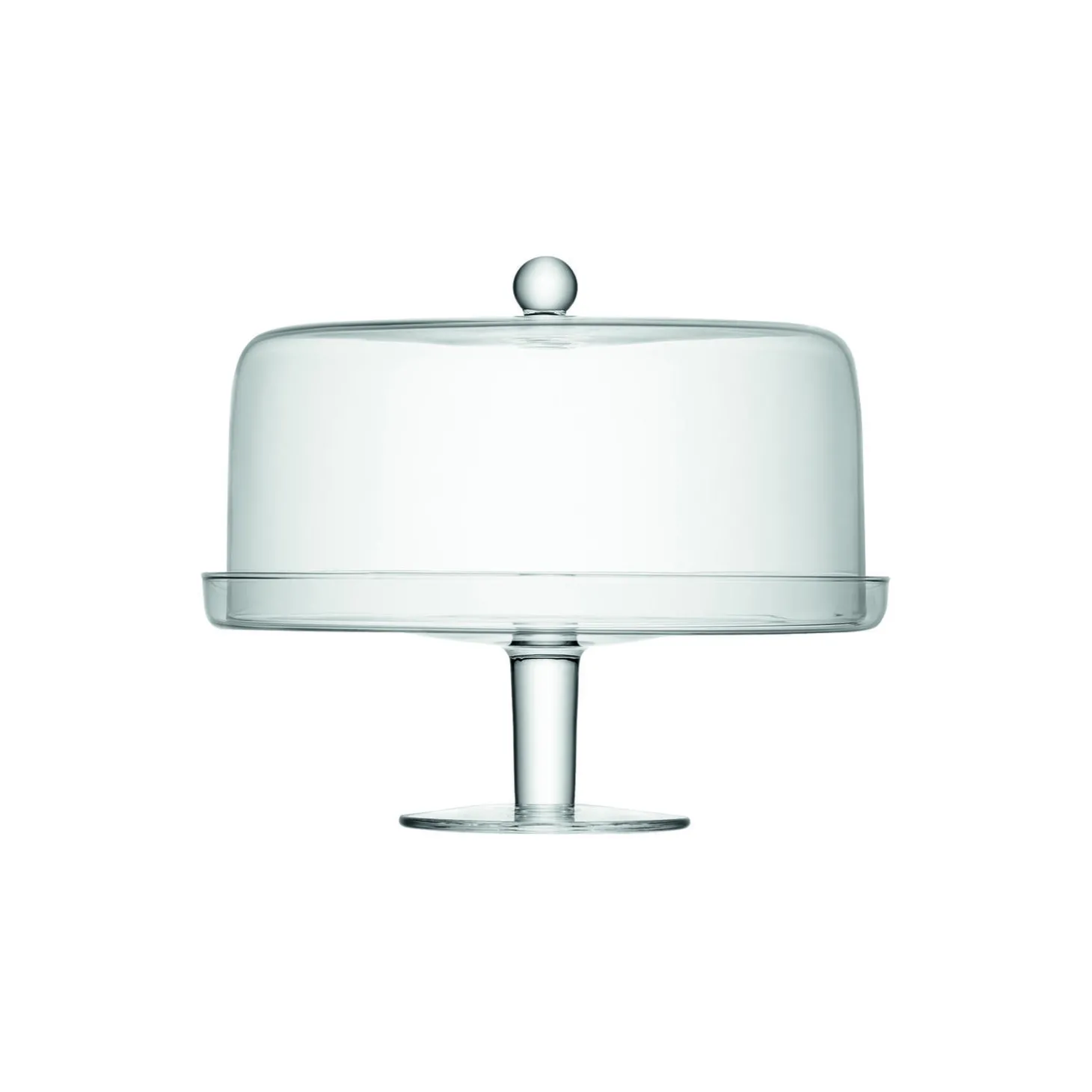 En stor mundblæst kagestand i glas med bred kuppel og kort tyk stilk. Designet til kager, bagværk eller petits fours.