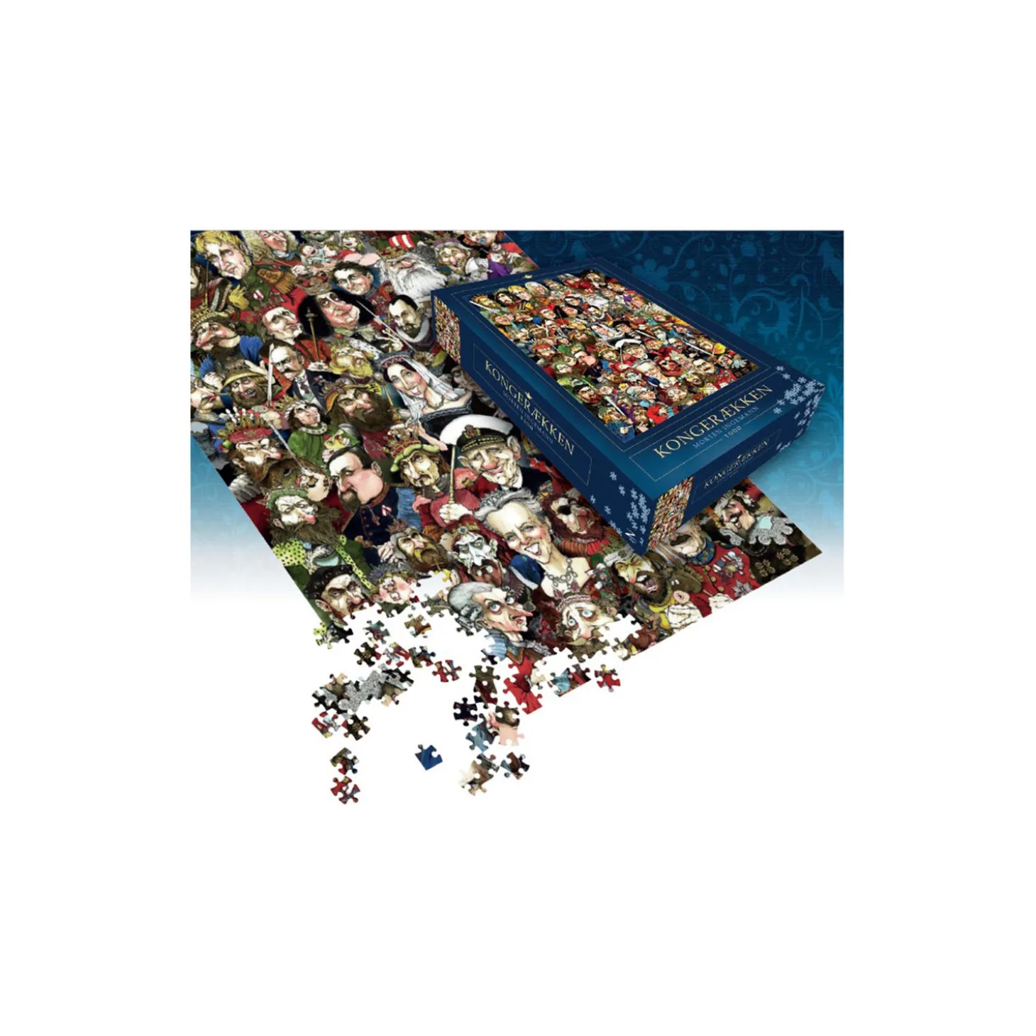 Kongerækken puslespil fra Forlaget Zebra. Designet af: Morten Ingemann. 1000 brikker og 2 indlægssedler. Mål: 5 x 29 x 20,5.