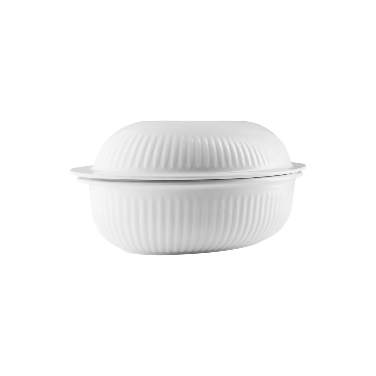 Den elegante stegeso er på én gang både stegegryde og serveringsfad. Tilbered først retten, lad den passe sig selv i ovnen og servér derefter den smagfulde simremad direkte i stegesoen, hvor låget også fungerer som serveringsfad. Stegesoen bevarer kraft, saft og smag i retten, fordi låget forhindrer dampen i at slippe ud. De praktiske håndtag, der er integreret i designet, gør det let at løfte stegesoen fra ovn til bord. Legio Nova er ligesom Legio porcelæn af høj kvalitet, der både tåler ovn, mikroovn og fryser. Der er 10 års porcelænsgaranti på stellet.