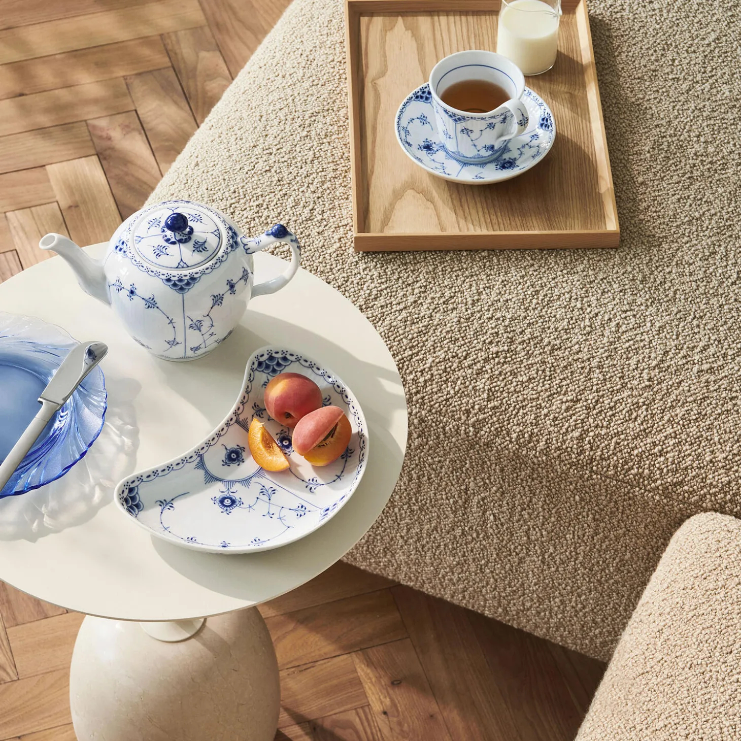 Det charmerende halvmåneformede fad i Musselmalet Halvblonde er et nyt formsprog på bordet til servering af alt fra snacks og søde sager til brød og forretter. Den ukonventionelle form inviterer til at lege med bordopdækningen og skabe små landskaber af smagfulde serveringer og spændende formsprog.