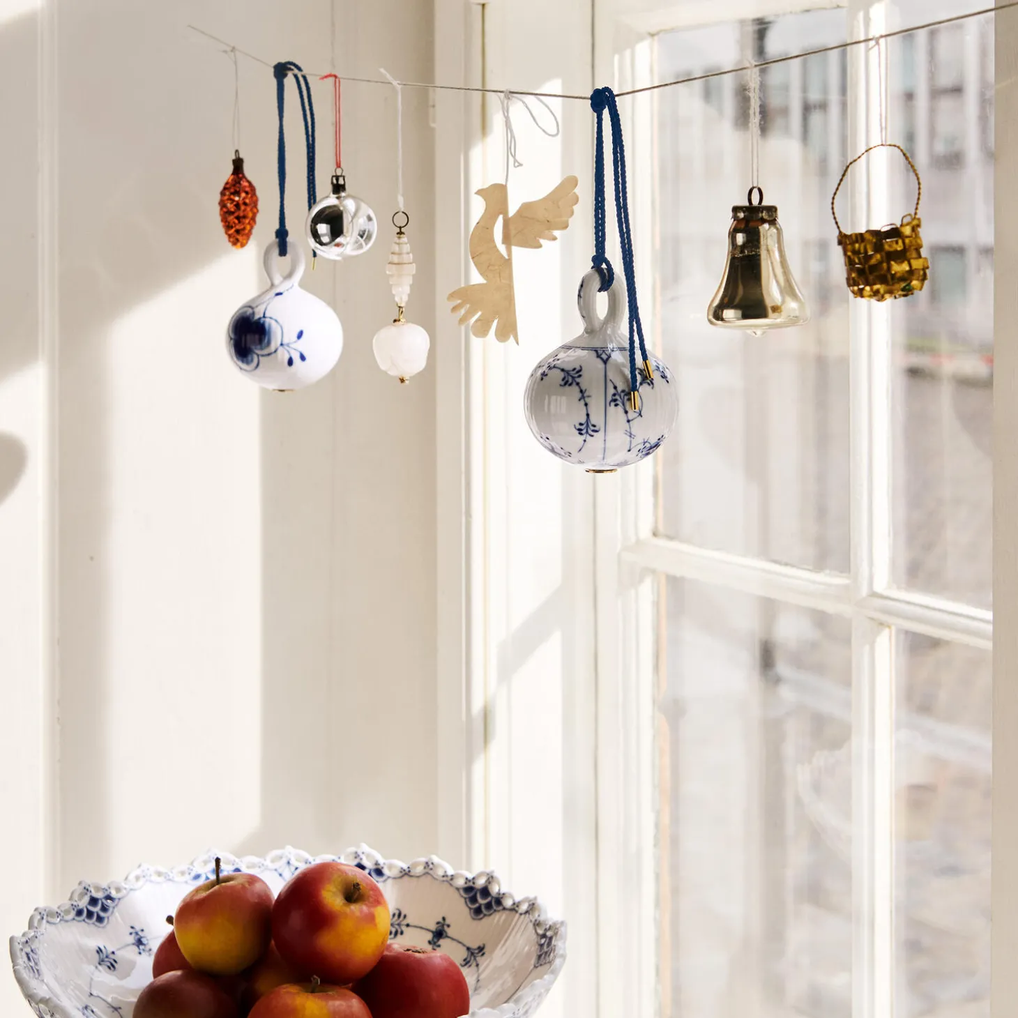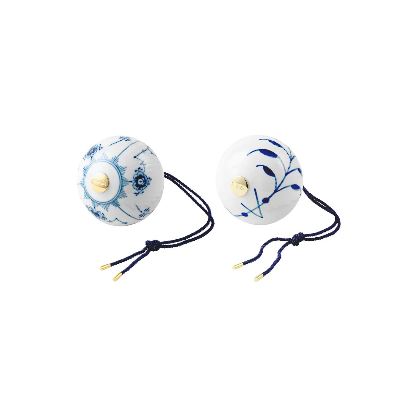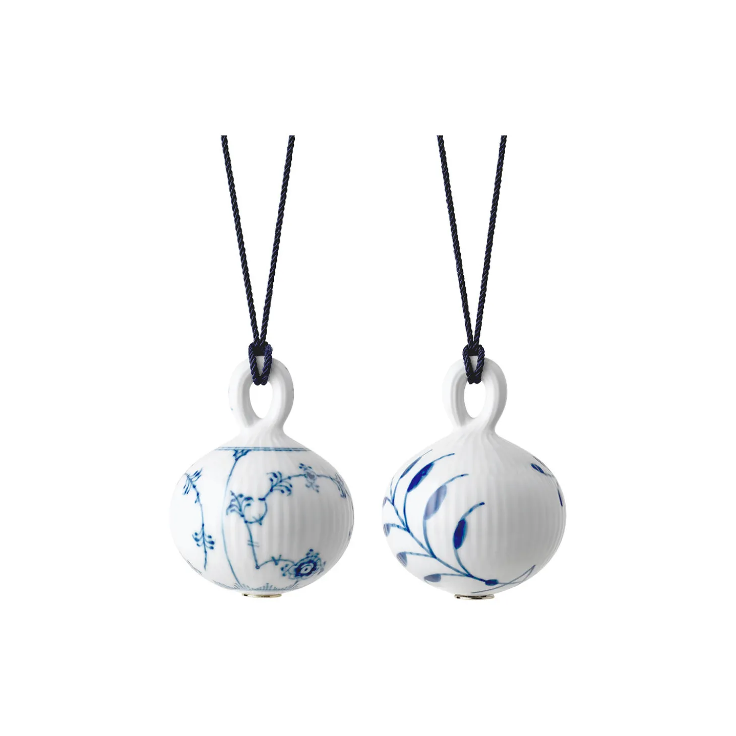 De to julekugler i dette sæt udgør et charmerende par. Det ikoniske Musselmalet Riflet mønster fra 1775 er elegant forstørret i Blå Mega Riflet fra 2000. Hver kugle er håndmalet af det kongelige blåmalere og de klassiske tre bølger er placeret på den gyldne plade i bunden af hver kugle.