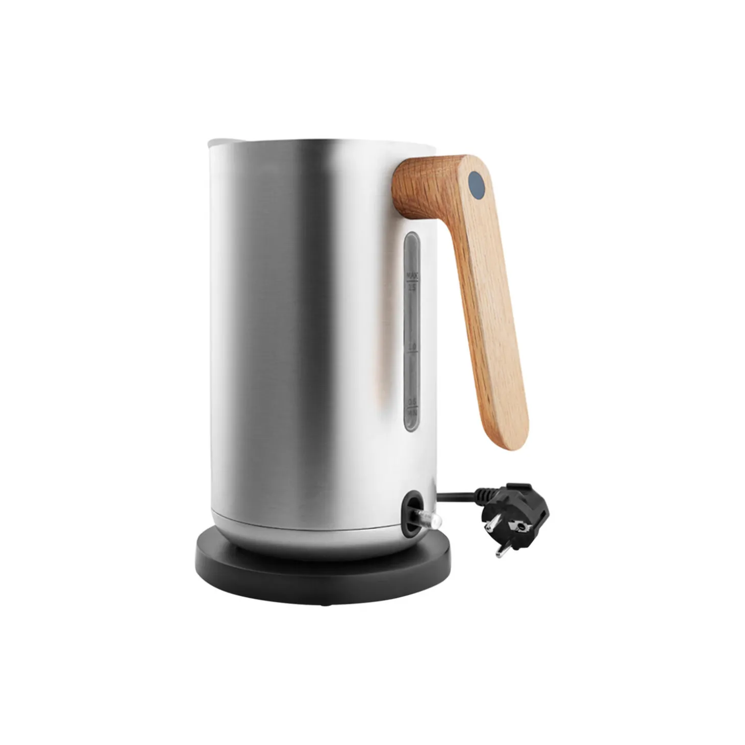 Et minimalistisk formsprog og en funktionel tankegang. Det er essensen af skandinavisk design og inspirationskilden til Nordic kitchen. Serien af køkkenudstyr passer perfekt ind i det nordiske køkken. Det gælder også den elegante og praktiske Nordic kitchen elkedel i børstet rustfrit stål med egetræshåndtag. Elkedlen er lige til at tage med fra køkkenet ind på sofabordet. Elkedlen har 360 graders mobilitet og er ledningsfri, så den er nem at fylde med vand og servere fra. En drypfri hældetud sikrer, at man kan hælde op uden at spilde. Påfyldning af vand sker ved at hælde vandet direkte gennem låget, som derfor ikke skal fjernes – hverken når kedlen fyldes, eller når der hældes fra den. Elkedlen er udstyret med en let aflæselig vandmåler, et skjult varmelegeme og automatisk slukning, når vandet koger.