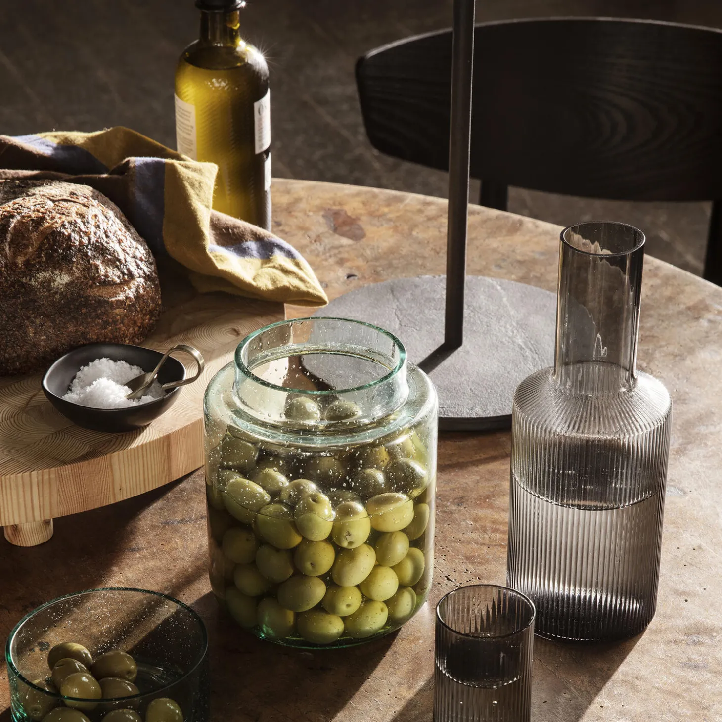Oli Container er inspireret af vintage-olivenkrukker og er en multifunktionel glasbeholder, der kan bruges både som opbevaringsbeholder og som vase. Den alsidige beholder er fremstillet af 100% genbrugsglas og har karakteristiske små bobler, der er skabt af luftlommer som med vilje er efterladt mellem lagene af mundblæst glas. Når det store låg ikke er i brug sammen med beholderen, kan det bruges som serveringsbakke. Vores Oli Container er både dekorativ og praktisk og desuden ideel til køkkener med åben opbevaring.