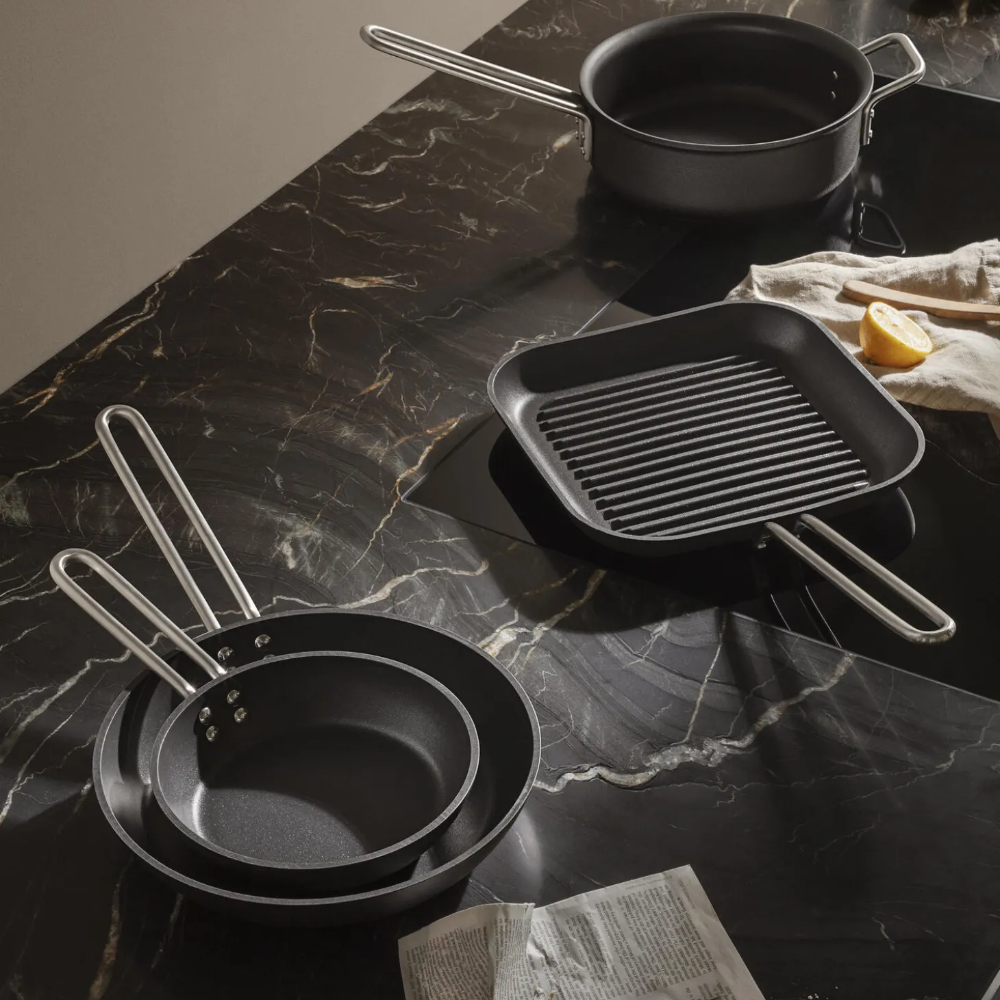 Det ultimative redskab til den ambitiøse kok. Perfekt til alt fra hård stegning ved høj varme til skånsom tilberedning af delikate råvarer. Den professionelle stegepandes korpus er fremstillet af 85 procent genanvendt aluminium og udstyret med en 10 mm bund, en 7 mm kant og et 10 mm wire greb. Den kraftige konstruktion sikrer maksimal holdbarhed og fremragende varmeregulering- og fordeling. Den keramiske Slip-Let belægning giver panden en fremragende slippeevne, der både letter madlavning og rengøring. Panden kan modstå temperaturer op til 400°C og fungerer på alle varmekilder, inklusive induktion. Vi tilbyder 5 års belægningsgaranti og 25 års garanti på, at panden holder formen og ikke bliver skæv i bunden. Tåler maskinopvask, men det anbefales at vaske panden i hånden for at bevare slippeevnen.