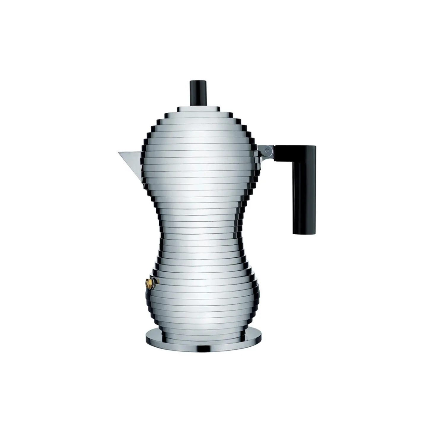 Pulcina espressokande i støbt aluminium og nylon fra Alessi. Farve: stål/sort. H: 20 x Ø 7,5-9,2 cm. Indeholder: 15 cl. 3 kopper. Design: Michele De Lucchi. Ikke egnet til induktion.