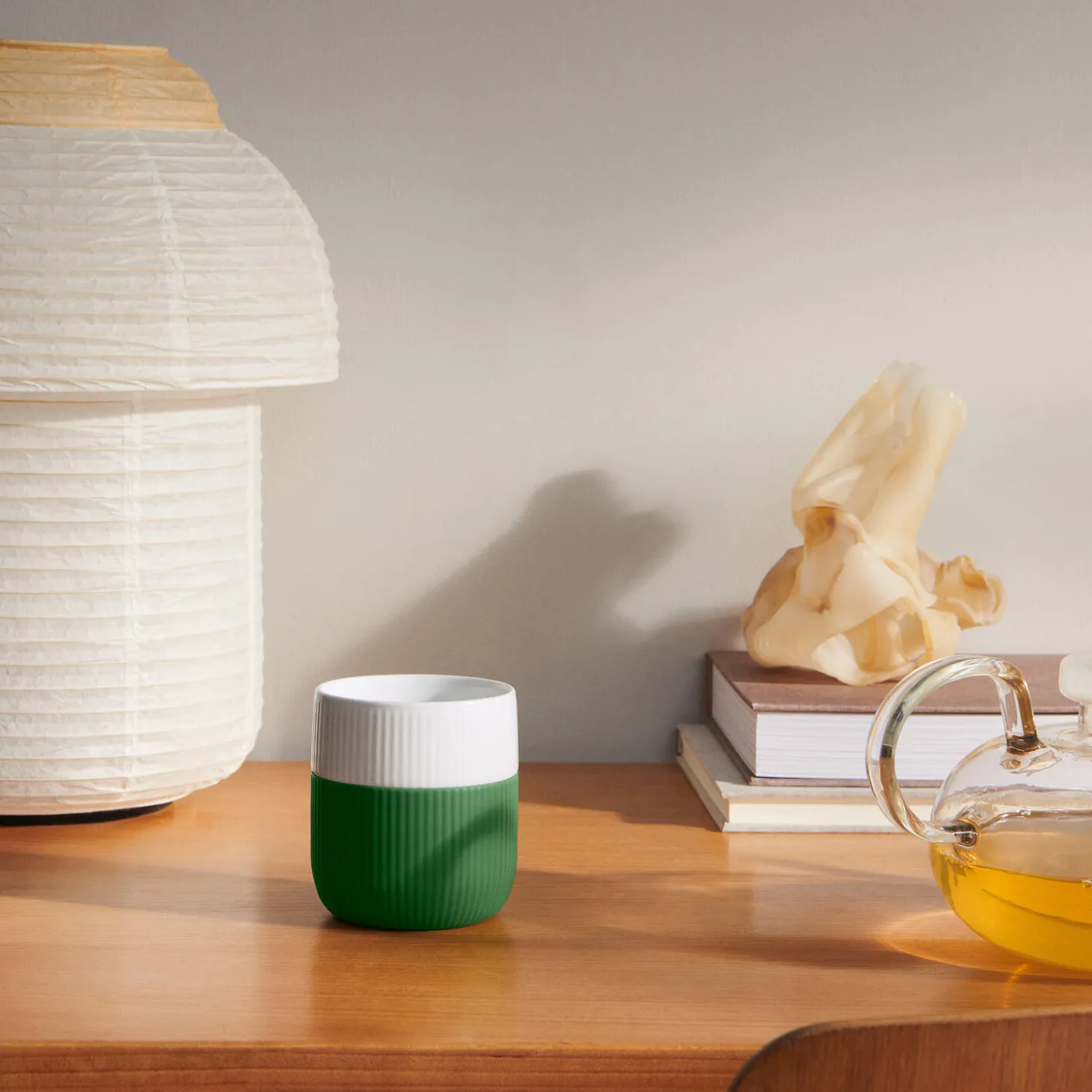 Bring naturen ind i dit hjem med det riflede Contrastkrus i skovgrøn. Det praktiske silikone hylster i mørkegrøn holder din drik varm og sikrer et behageligt greb. Kruset er en del af kollektionen Riflet Contrast; et udvalg af farverige og alsidige krus.
