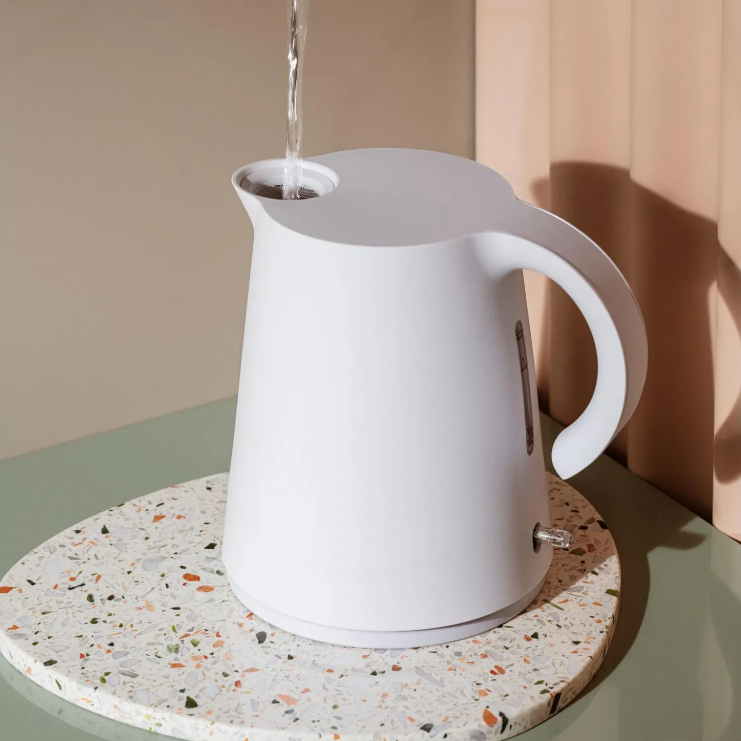 Elkedlen har et praktisk, ledningsfrit design med 360° mobilitet. Et enkelt påfyldningssystem gør den nem at bruge, vandet hældes blot direkte på gennem et hul i låget. Basen sikrer, at den fylder minimalt på køkkenbordet. Afkalkning og rengøring er nem, da filteret kan tages ud. Hvidt lys ved tænd- og sluk-knappen indikerer om kedlen er i brug og den let aflæselige vandmåler gør det nemt at se, hvor meget vand, den indeholder. Varmelegemet er skjult, og kedlen slukker automatisk, når vandet koger, så du undgår tørkogning. Kedlen tåler ikke maskinopvask.