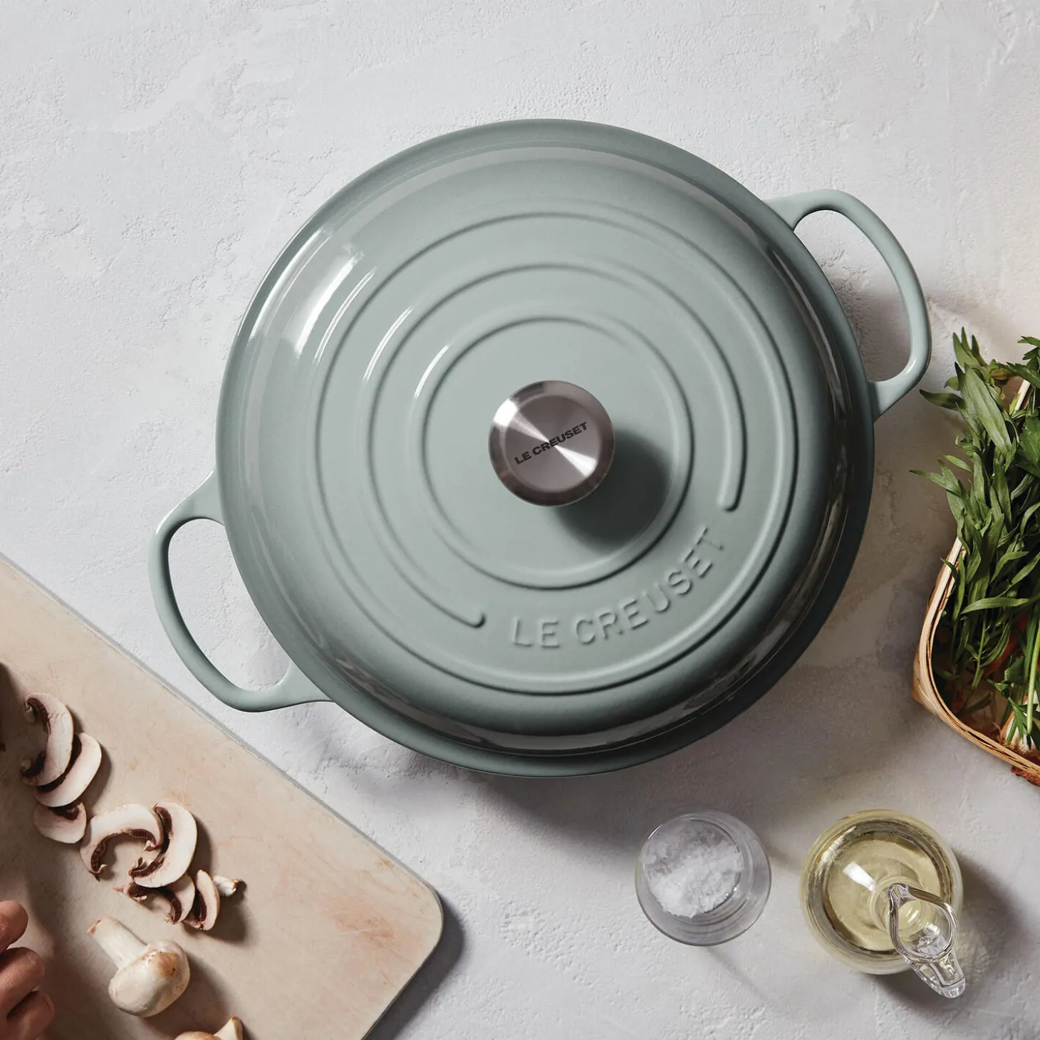 Vores støbejernsprodukter fremstilles på vores eget franske støberi og er vaskeægte køkkenlegender. Denne buffetgryde er ingen undtagelse. Den store, flade form og de lave kanter gør den perfekt til at brune kød og grøntsager, simre gryderetter, lynstege og bage. Den karamelliserer maden effektivt, så du får velsmagende resultater. Låg med rustfri stål- eller fenolknop tåler opvaskemaskine. Låg med guld-, iriserende-, kobber- og sort nikkelknop skål håndvaskes for at bevare deres finish. Egnet til følgende varmekilder: ovnens grill, ovn, elektrisk, keramisk kogeplade, gas og induktion.
