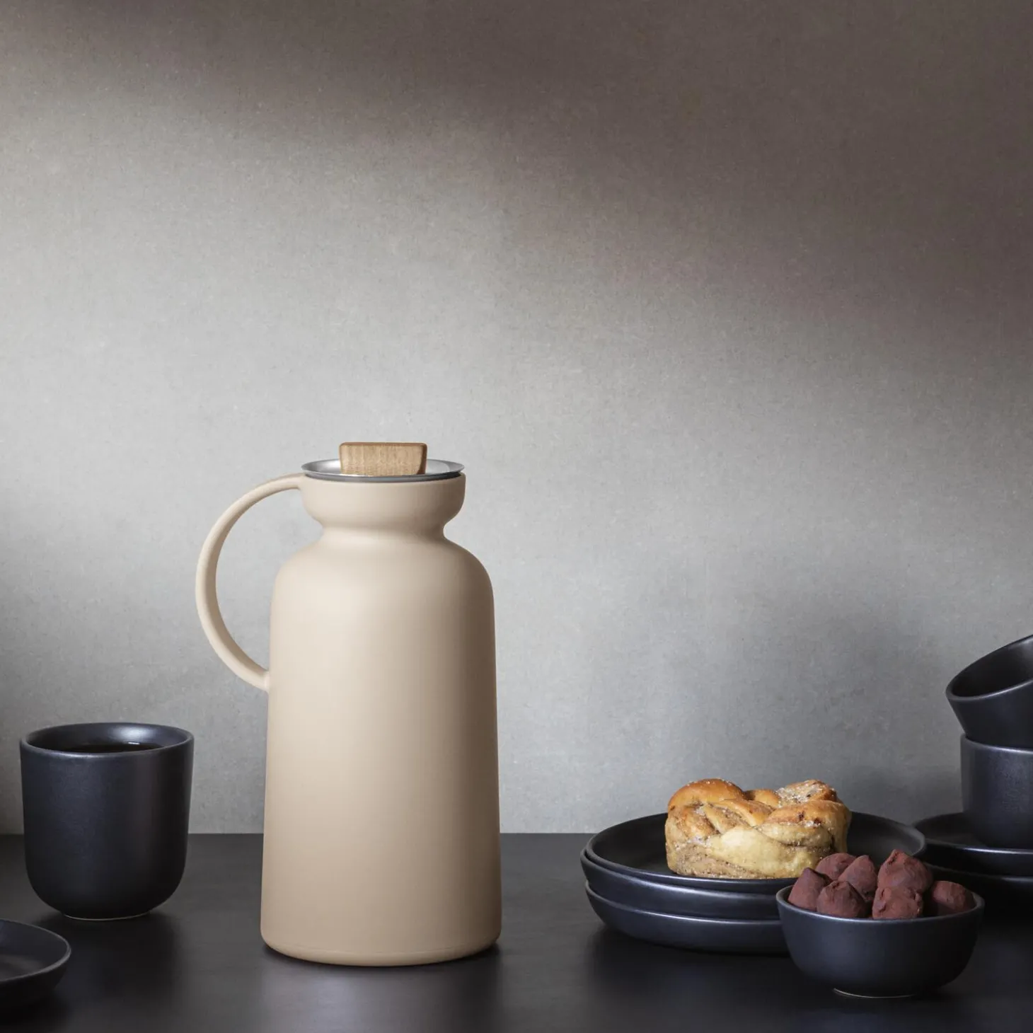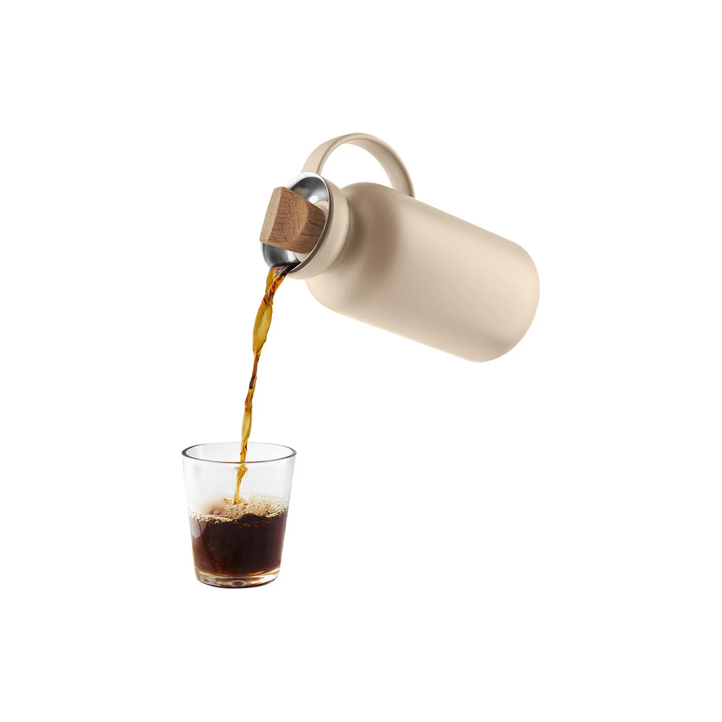 Bag Silhouettes indbydende ydre gemmer sig en indsats af stål, som gør termokanden robust og hårdfør, og så tåler den tilmed maskinopvask (dog ikke låget, der skal tørres med en opvredet klud). Termokanden holder på varmen i timevis, og en praktisk hældekrave af stål forhindrer indholdet i at dryppe på bordet. Egetræet vedligeholdes ved regelmæssig oliering.