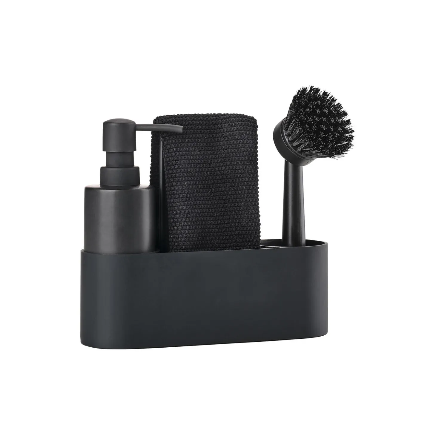 I vores Singles-univers finder du et kompakt alt-i-ét opvaskesæt, inkl. karklud, med elegante former. Rund og blød at se på og røre ved – bygget op omkring en silikonebeholder med plads til sæbedispenser i den ene ende og opvaskebørste i den anden. Rummet i midten af opvaskesættet kan eksempelvis indeholde skuresvamp og klud, mens metalbøjlen er både en praktisk hank og et glimrende tørrestativ for kluden. Sæbedispenseren er fremstillet i solid keramik, mens opbevaringsdelen er i ridsefri og rengøringsvenlig silikone. Den medfølgende mikrofiberklud indeholder naturligvis ikke mikroplastik, ligesom børstehovedet kan udskiftes.