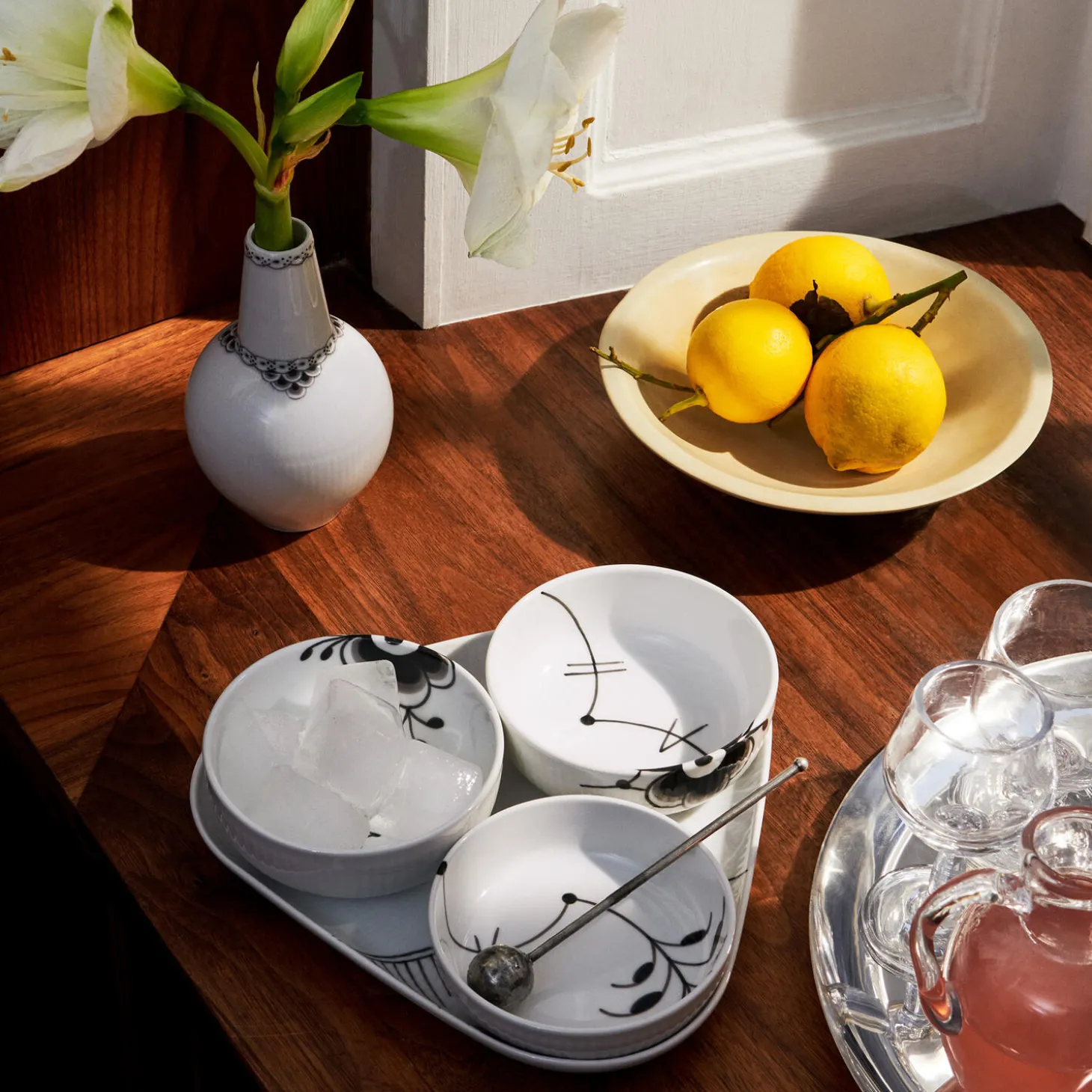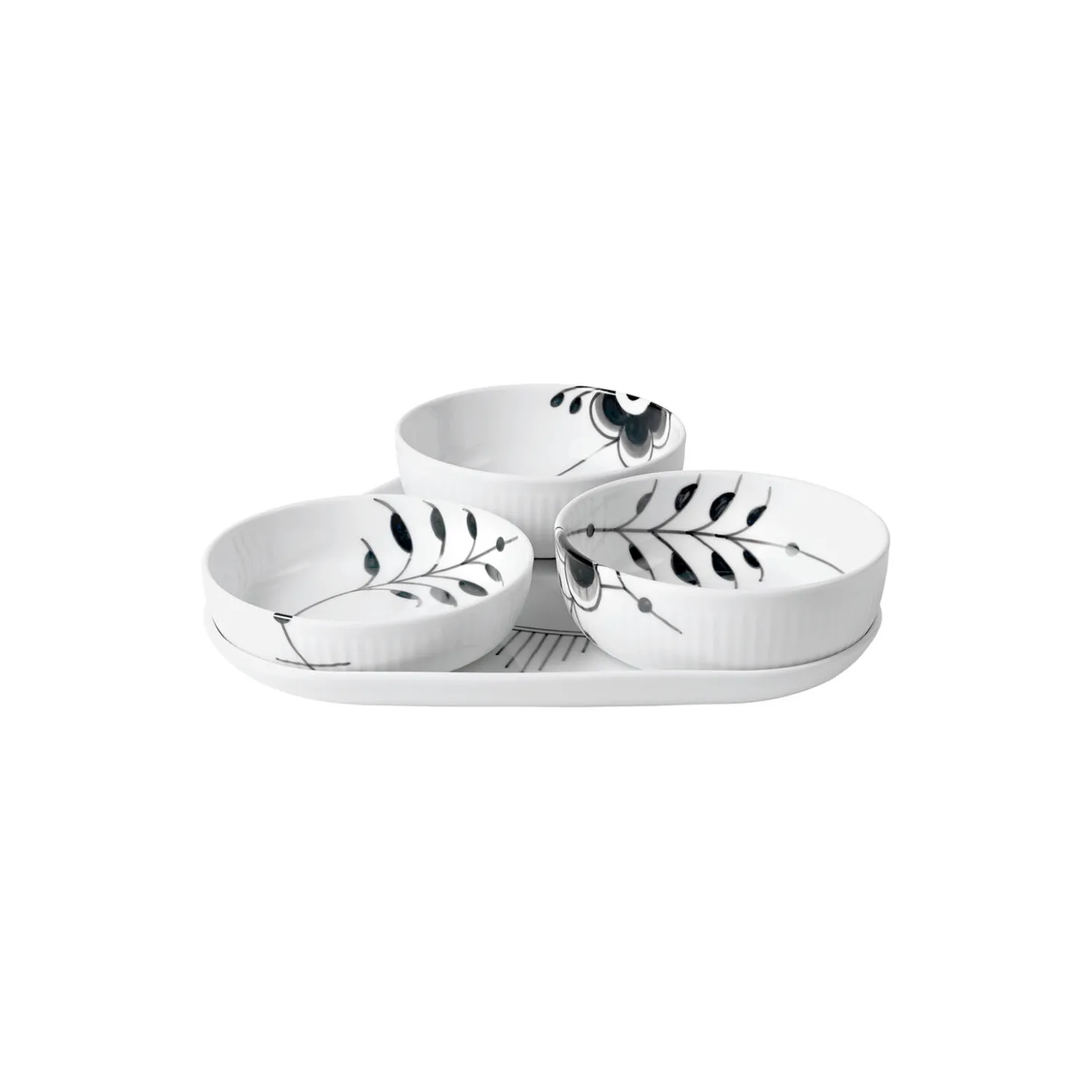 Det Sort Mega Riflet-serveringsæt er den perfakte tilføjelse til hjemmene til dem, der elsker at holde middagsselskaber. Sættet kan bruges til servering af snacks eller tapas eller som individuelle serveringsdele. To små skåle og en lidt større skål på et trekantformet fad for nem opbevaring og servering – alle smukt håndmalede i det sorte riflede megamønster.