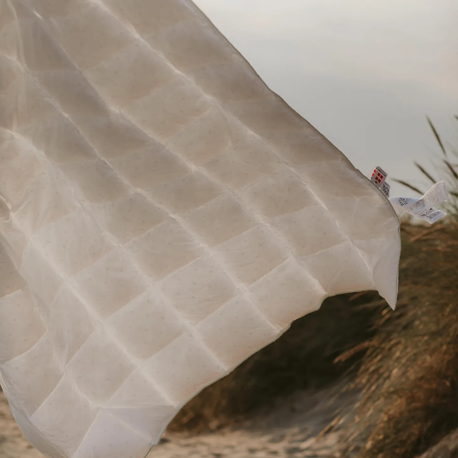 En fyldigere sommerdyne, der holder dig kølig. Fossflakes sommerdynen er en allergivenlig fiberdyne, der minder mere om en dundyne. Fyldet er nemlig et løst materiale som dun er, en unik blanding af de fine små Fossflakes og ultralette polyesterkuglefibre. Luftindholdet heri lader fugt og varme fordampe og det gør dynen åndbar. Dynen er desuden syet med små, gennemstukne kassetter, der skaber såkaldte ‘kuldebroer’, som sammen med det åndbare fyld sikrer dig en kølig nattesøvn. Fyldet fordeler sig jævnt, kan altid rystes op og danner ikke klumper efter brug og vask. Både fyld og vår er certificeret efter strengeste Oeko-Tex Standard 100 Class 1. Dynevåret er syet i 100% bomuld.Fossflakes dyner er nemme at vedligeholde og bevarer sin fylde, selv efter hyppig vask. Maskinvaskes ved 60° C og holdes derved fri for støvmider. Brug enzymfrit vaskemiddel og undgå brug af skyllemiddel. Kan tørretumbles på uld eller silkeprogram. Tåler ikke høj varme. Er du i tvivl om din maskine kan overholde varmegraderne, så lad i stedet dit Fossflakes produkt lufttørre. Fossflakes er designet og produceret i Danmark.