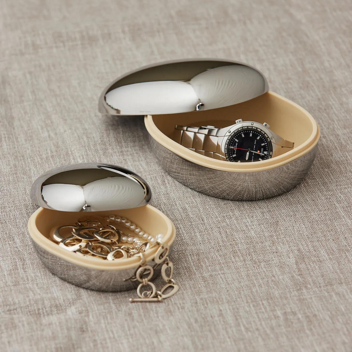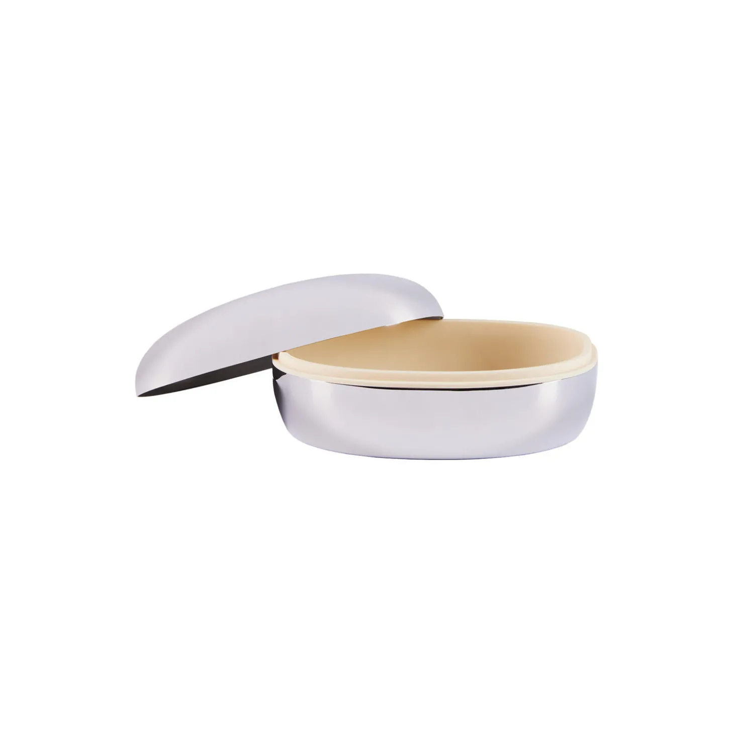 Piet Heins smykkeskrin i rustfrit stål er formet som en elegant superellipse, der forener tidløst design og funktionalitet. Det polerede stål skaber et sofistikeret udtryk, mens det rummelige indre og det bløde indlæg gør det ideelt til opbevaring af smykker. Smykkeskrinet kan fås i to størrelser og med blank eller børstet overflade. Ideel som gave til særlige lejligheder, med mulighed for gravering af navn og dato.