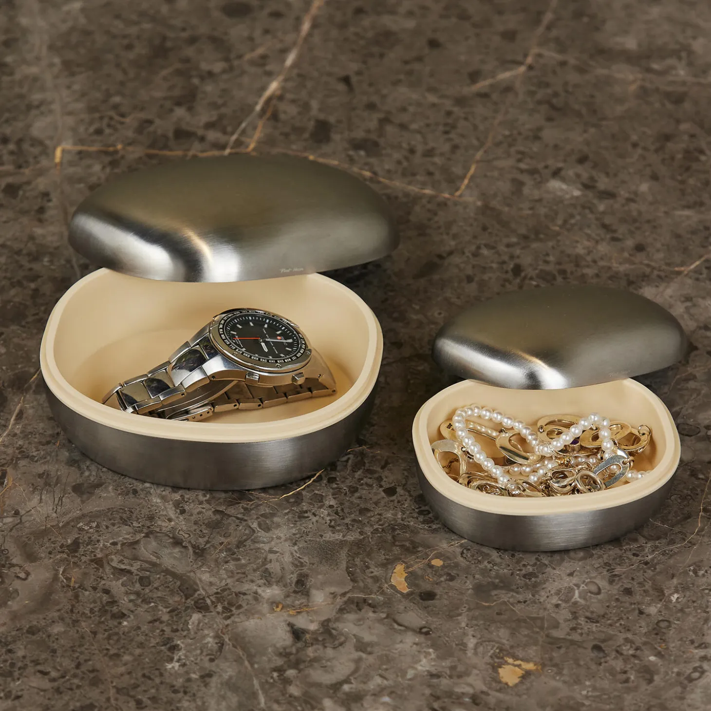 Piet Heins smykkeskrin i rustfrit stål er formet som en elegant superellipse, der forener tidløst design og funktionalitet. Det polerede stål skaber et sofistikeret udtryk, mens det rummelige indre og det bløde indlæg gør det ideelt til opbevaring af smykker. Smykkeskrinet kan fås i to størrelser og med blank eller børstet overflade. Ideel som gave til særlige lejligheder, med mulighed for gravering af navn og dato.