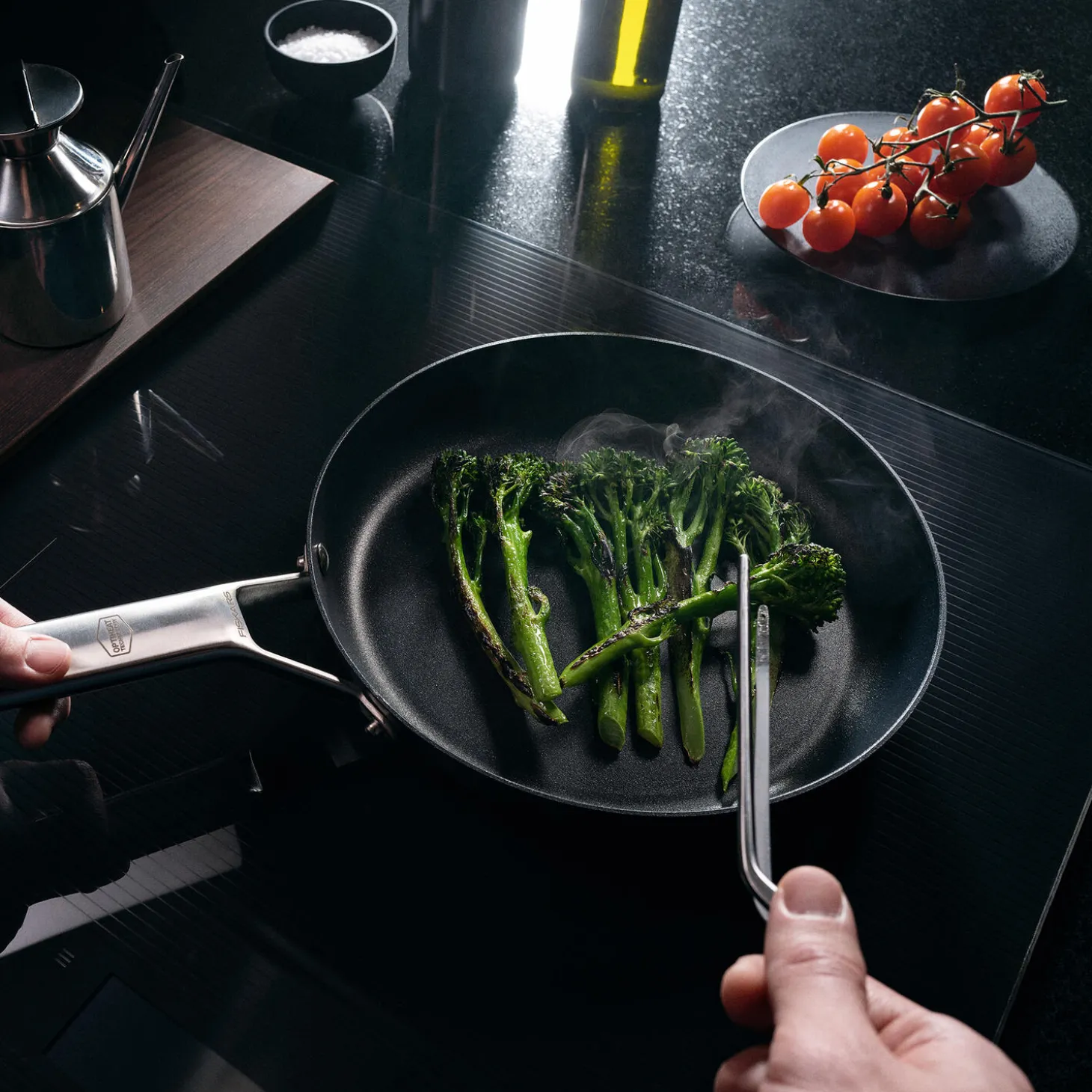 Fiskars Taiten er innovativt kogegrej, der slipper fantasien løs og giver fuld kontrol, når du frembringer lækre, kreative retter. Taiten stegepande på 24 cm med OPTIHEAT™ er fremstillet af 100 % genanvendt aluminium i høj kvalitet, som leder varmen ekstremt godt, hvilket betyder, at maden ikke kun opvarmes fra bunden, men også fra siderne af panden. Den revolutionerende OPTIHEAT™-teknologi forhindrer panden i at blive overophedet på induktionszoner ved midlertidigt at afmagnetisere materialet, når temperaturerne når over 230 °C, hvilket gør Taiten til det innovative valg til det moderne køkken. Pandens non-stick Ceratec™-belægning uden plast giver den enestående non-stick egenskaber. En unik energibesparende bund optimerer stegefadets bund til 50 % hurtigere opvarmning og giver god temperaturstyring, samtidig med at den bruger 30 % mindre energi på glaskeramiske kogezoner Dens langtidsholdbare design omfatter et klassisk, ergonomisk håndtag i rustfrit stål. Kan bruges på alle kogezoner og i ovnen ved temperaturer op til 270 °C. Designet og fremstillet i Finland. Nem at genanvende.