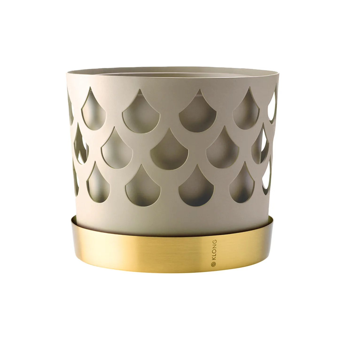 The flower pots’ cut-through pattern creates depth and shadows. It is available in three sizes, two patterns and several colours. The inner and outer pots are made of stainless steel and the tray is made of brass.